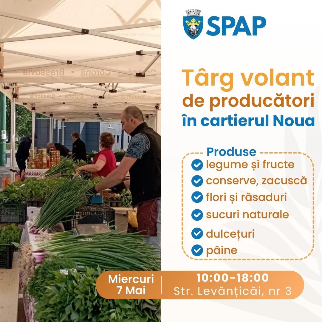 Miercuri, 7 mai, brașovenii sunt invitați la piața volantă din cartierul Noua, pe strada Levănțicăi nr. 3, unde vor găsi cele mai proaspete produse de sezon, direct de la producători locali și din țară. Între orele 10:00 și 18:00, vizitatorii pot alege dintr-o ofertă variată: fructe proaspete și uscate, sucuri naturale, legume de sezon, salată, […]