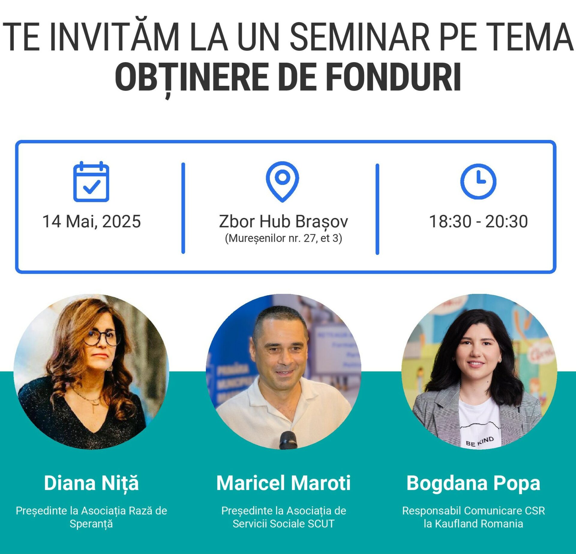 Dorești să înveți cum să strângi fonduri pentru o cauză dragă sau să îți dezvolți abilitățile de fundraising pentru organizația ta nonprofit? Ești invitat să participi la seminarul „Obținere de Fonduri”, un eveniment dedicat pasionaților de implicare socială, organizat pe 14 mai 2025, la Zbor Hub Brașov (Str. Mureşenilor nr. 27, etaj 3), între orele […]