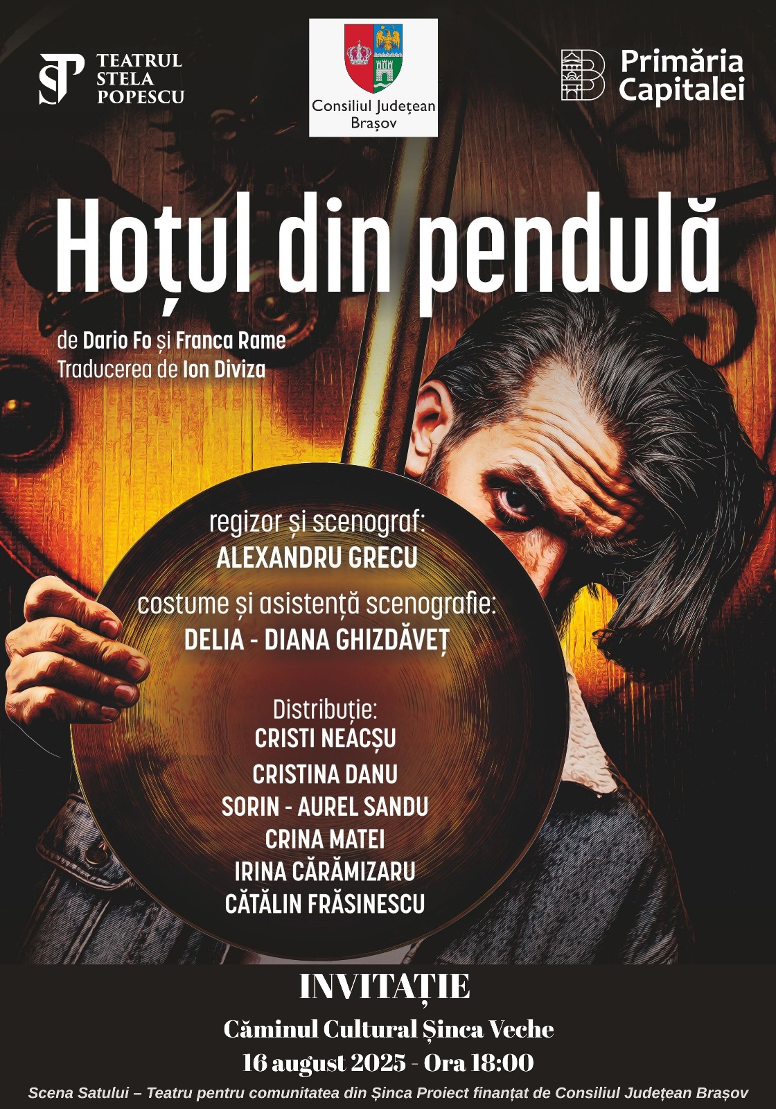 Sâmbătă, 16 august, începând cu ora 18:00, la Căminul Cultural Şinca Veche va avea loc spectacolul de teatru „Hoțul din pendulă”, de Dario Fo, susținut de actorii Teatrului „Stela Popescu” din București. În distribuţie regăsim actori cunoscuți în lumea teatrului și a televiziunii: Crina Matei, Cristi Neacșu, Cristina Danu, Sorin Aurel Sandu, Irina Cărămizaru și […]
