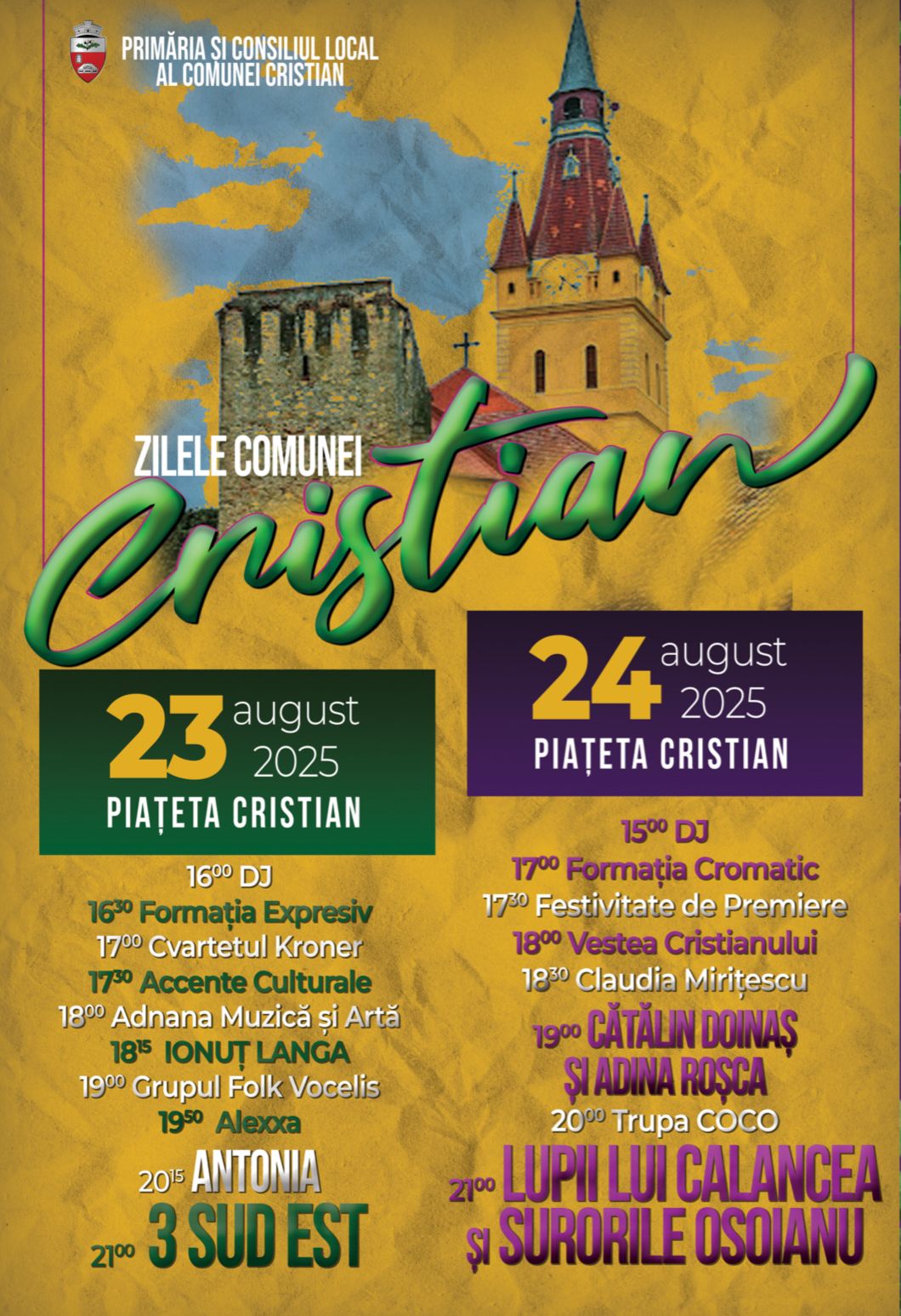 În weekendul 23–24 august 2025, comuna Cristian se transformă într-un adevărat centru al muzicii și tradițiilor locale. Primăria și Consiliul Local îi invită pe locuitori și vizitatori la două zile pline de concerte, recitaluri și momente artistice, desfășurate în piațeta centrală. Intrarea este liberă, iar atmosfera promite să fie una de sărbătoare autentică. Sâmbǎtǎ, 23 […]