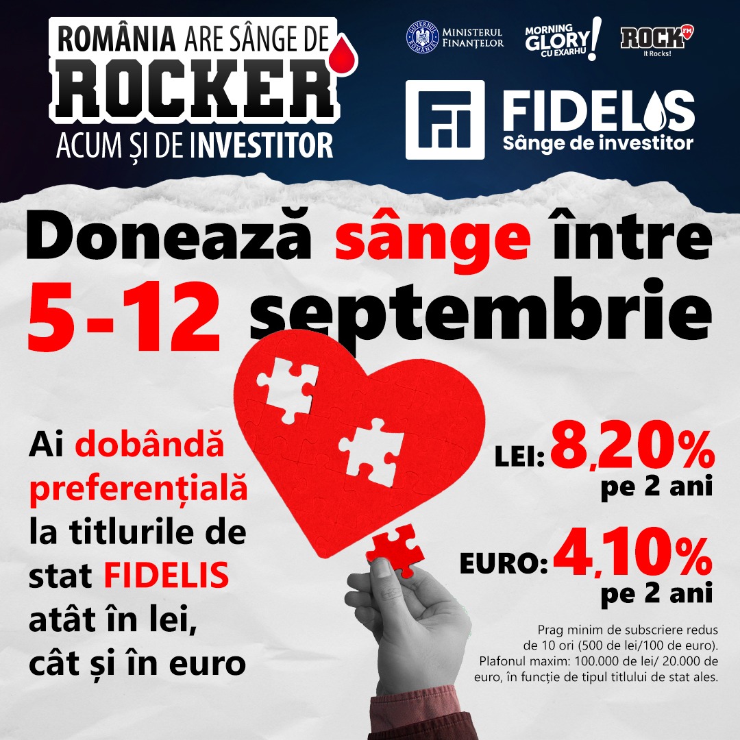 Începând de astăzi, 5 septembrie, până vineri, 12 septembrie, persoanele fizice rezidente și nerezidente, cu vârsta peste 18 ani, pot subscrie în titlurile de stat FIDELIS denominate în lei și în euro, prin intermediul băncilor partenere: BT Capital Partners&Banca Transilvania, Banca Comercială Română, B.R.D. – Groupe Société Générale, UniCredit Bank și TradeVille în parteneriat cu […]