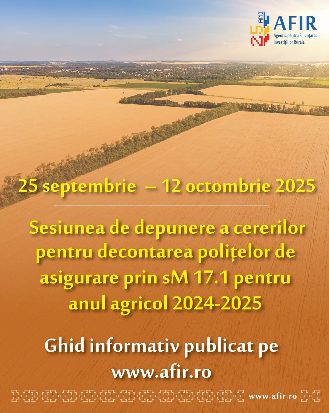 Agenția pentru Finanțarea Investițiilor Rurale (AFIR) a publicat spre informare Ghidul Solicitantului pentru Submăsura 17.1 „Prime de asigurare a culturilor, animalelor și a plantelor” din cadrul PNDR, aplicabil anului agricol 2024 – 2025. Fermierii vor putea depune online cererile de finanțare în perioada 25 septembrie 2025 – 12 octombrie 2025. Prin această submăsură, agricultorii beneficiază […]