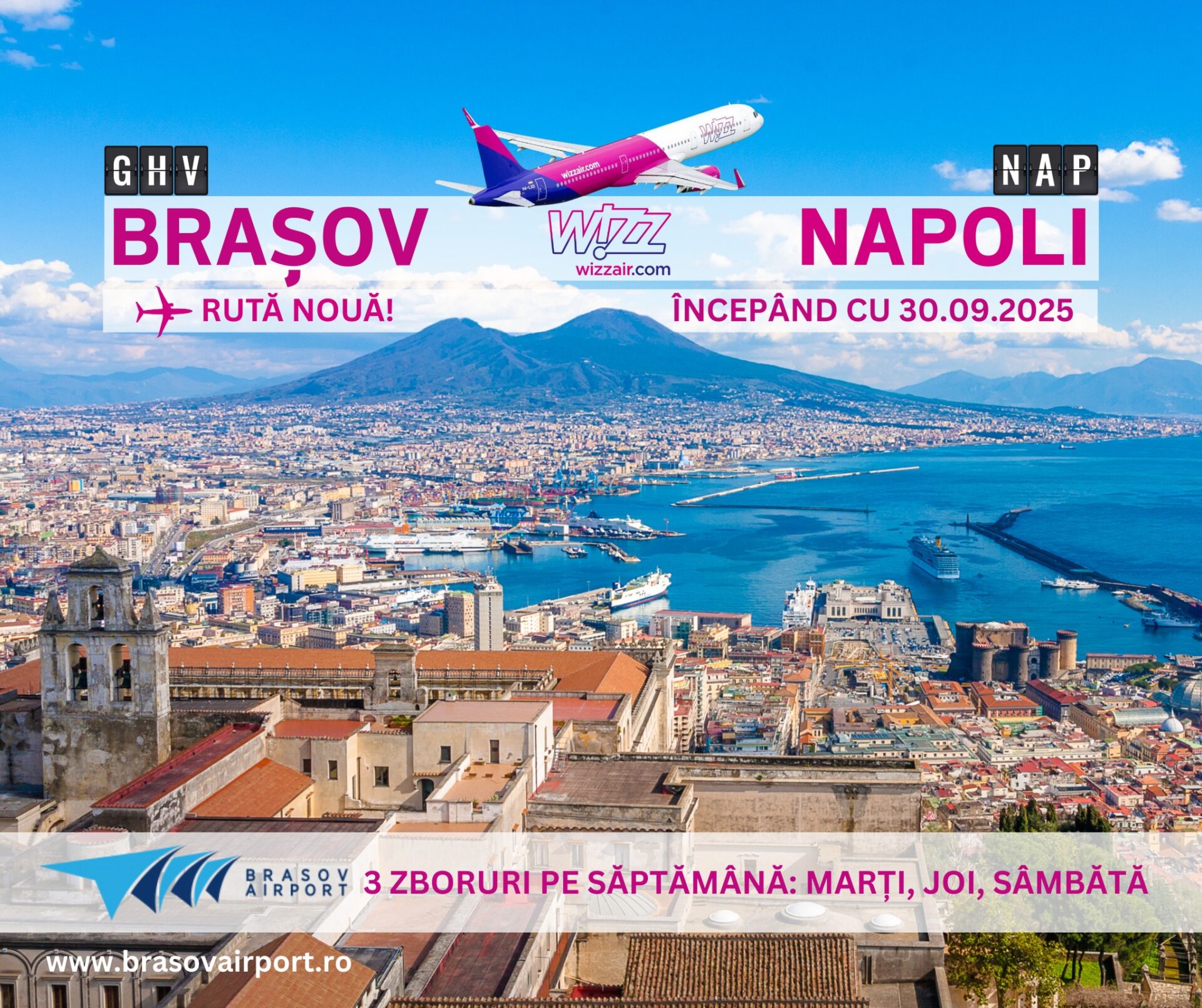 Aeroportul Internațional Brașov-Ghimbav se pregătește pentru un nou moment de referință: peste doar două săptămâni, va fi inaugurat zborul direct către Napoli, una dintre cele mai vibrante destinații din Italia. Ruta Napoli (NAP) – Brașov (GHV) – Napoli (NAP) va fi operată de compania Wizz Air, oferind pasagerilor din centrul României o conexiune rapidă și […]