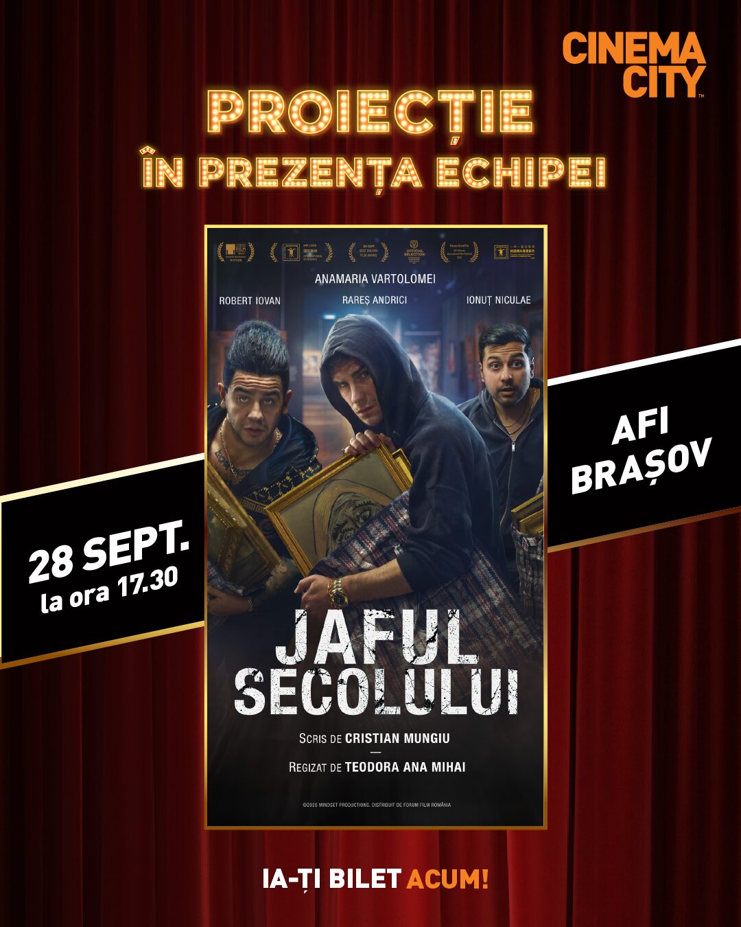 Scenaristul și producătorul Cristian Mungiu prezintă filmul „Jaful secolului” pe 28 septembrie, la Cinema City AFI Brașov, la 17:30. Cristian Mungiu va răspunde întrebărilor publicului după vizionarea filmului ce reprezintă propunerea României la Premiile Oscar, în categoria Cel mai bun film internațional. BILETE: online și la casieria cinematografului. Filmul este inspirat din fapte reale – […]