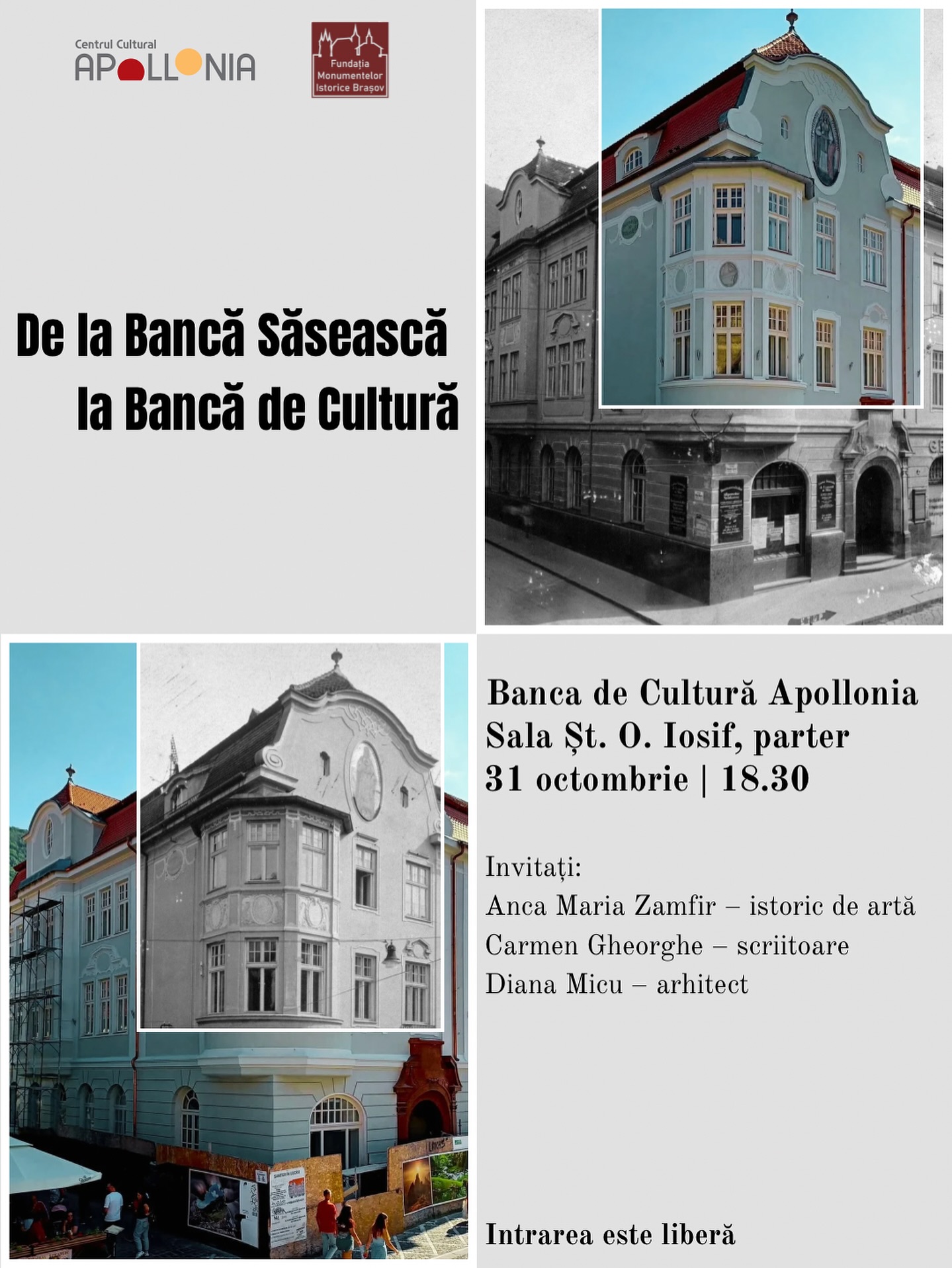 Vineri, 31 octombrie, sunteți așteptați la o seară specială dedicată istoriei, arhitecturii și renașterii culturale a uneia dintre cele mai emblematice clădiri ale orașului — fosta Bancă Săsească, transformată astăzi în Banca de Cultură Apollonia. Evenimentul, organizat de Centrul Cultural Apollonia și Fundația Monumentelor Istorice Brașov, cu sprijinul Primăriei Municipiului Brașov, promite o incursiune captivantă […]