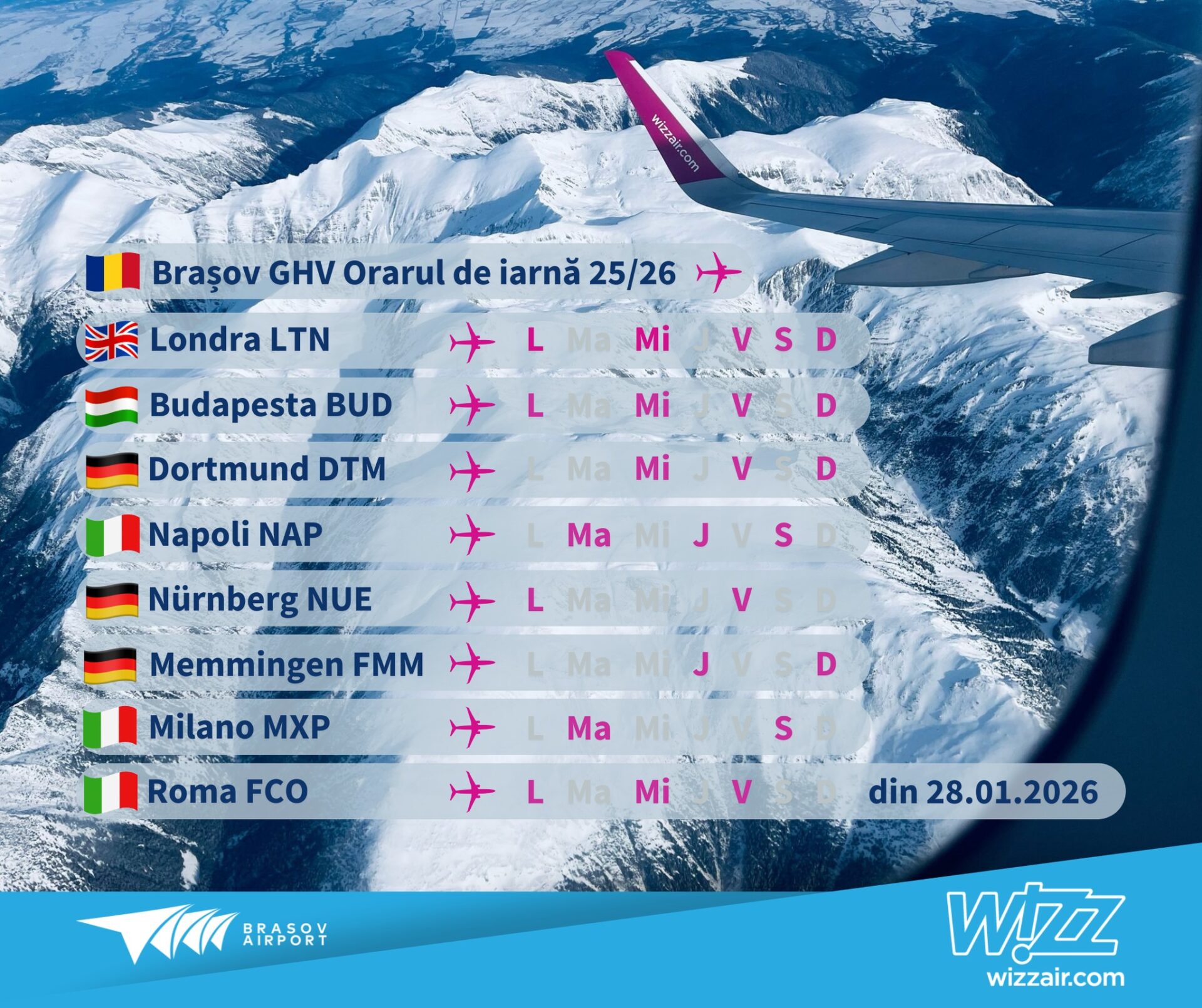 Orarul de iarnă 2025-2026 8 destinații 24 de frecvențe/săptămână Bilete pe site-ul www.wizzair.com În decembrie, aproape toate rutele vor avea câte o frecvență în plus.