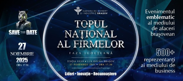 Camera de Comerț și Industrie Brașov organizează joi, 27 noiembrie 2025, începând cu ora 17:30, cel mai prestigios eveniment de business din județul Brașov: Topul Național al Firmelor, faza județeană 2025. Comunitatea de business este invitată să ia parte la evenimentul emblematic al mediului economic brașovean, unde vom celebra excelența, inovația și liderii care conturează […]