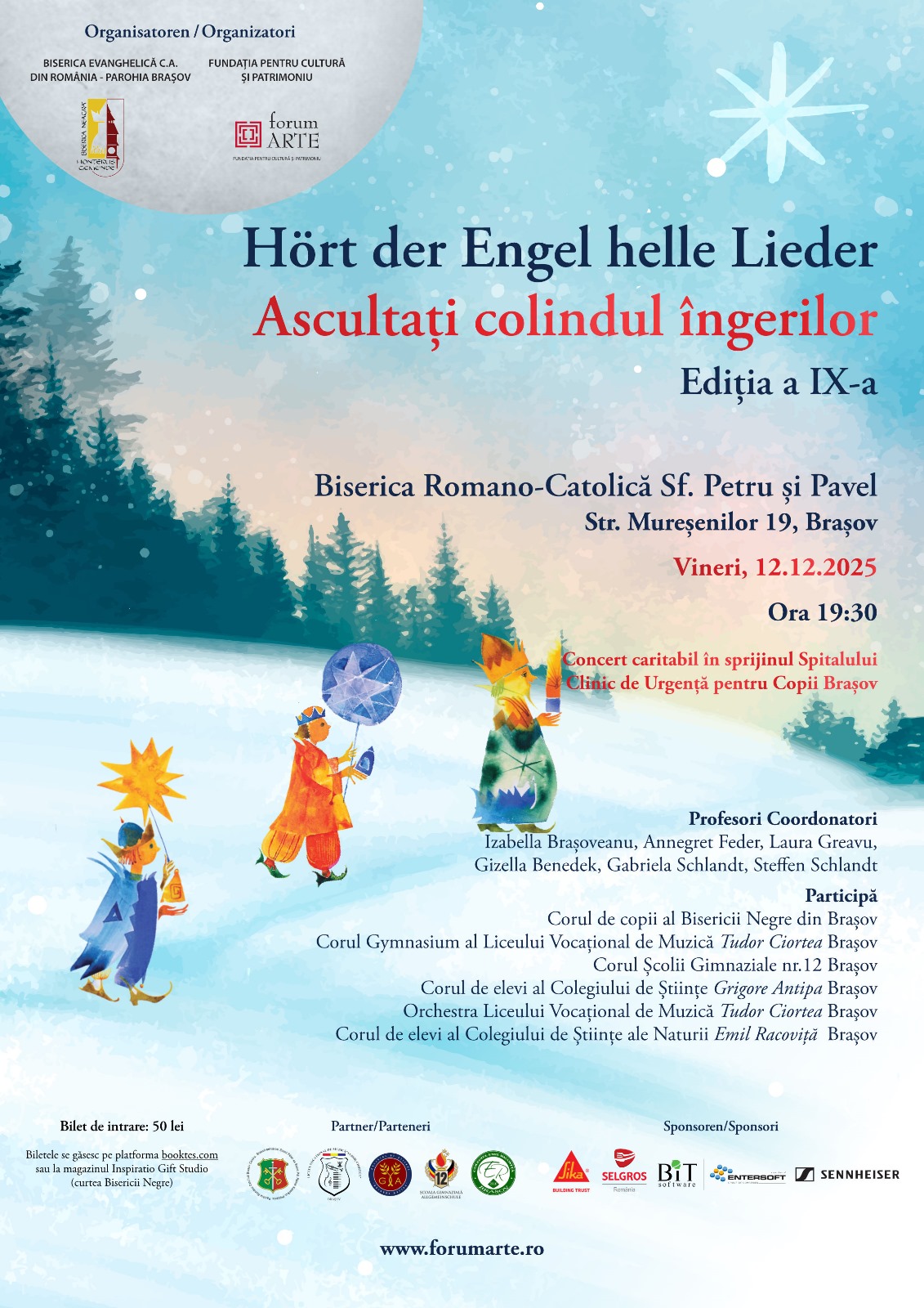 Fundaţia pentru Cultură şi Patrimoniu Forum ARTE organizează în data de 12 decembrie, de la ora 19.30, alături de Biserica Evanghelică C.A. din România – Parohia Brașov, concertul caritabil Ascultați colindul îngerilor, un concert al copiilor pentru copii, ajuns la cea de-a IX-a ediție. Partenerii acestui proiect sunt Liceul de Muzică „Tudor Ciortea”, Școala Gimnazială […]