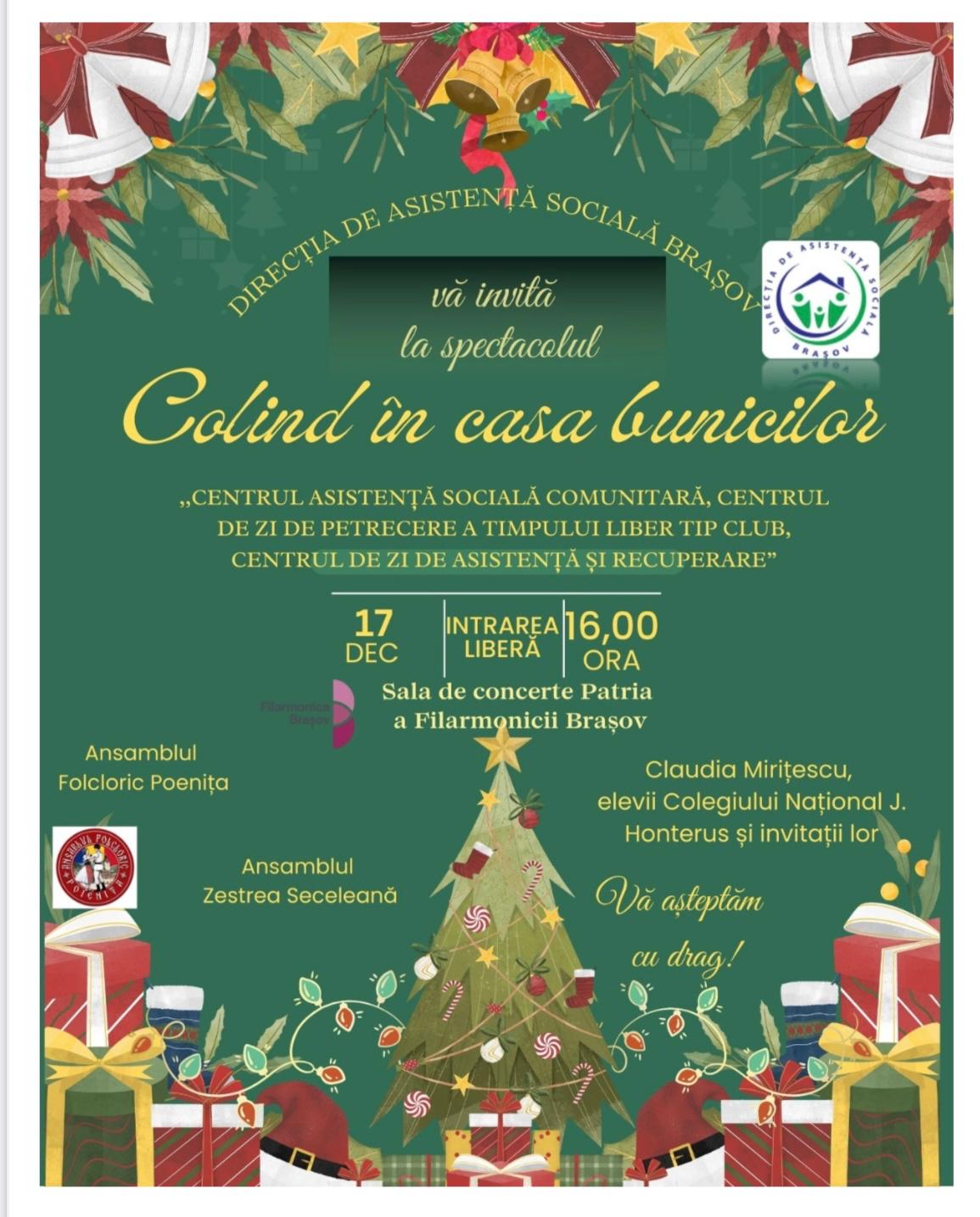 Direcția de Asistență Socială Brașov vă invită în data de 17.12.2024, începând cu orele 16:00 în Sala Filarmonicii Brașov la a – VII – a ediție a spectacolului artistic dedicat Sărbătorii Nașterii Domnului Iisus Hristos și sărbătorilor de iarnă. este o sărbătoare muzicală plină de bucurie pentru toți participanții, prin bucuria împărtășită de către seniorii […]