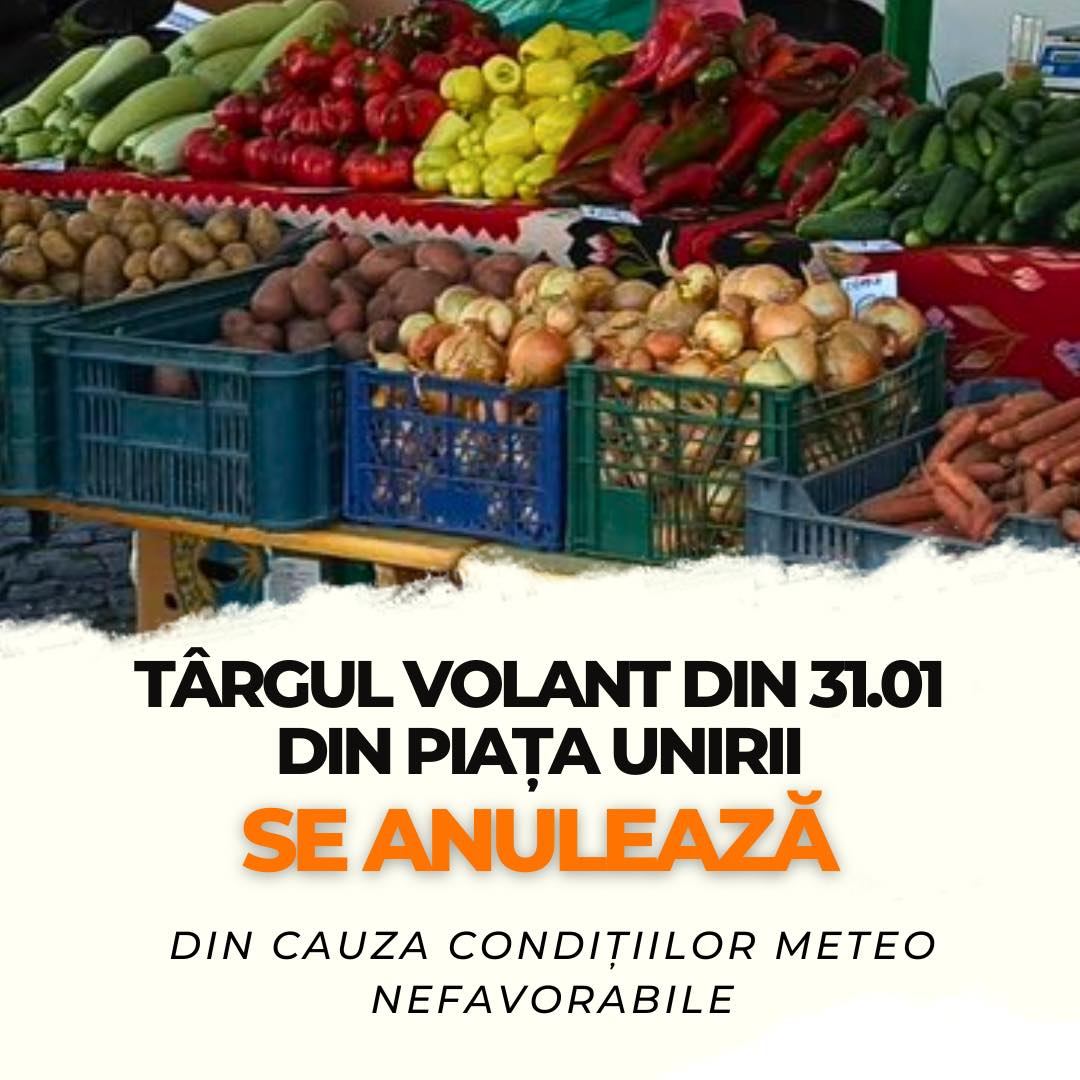 Organizatorii anunță anularea târgului volant de producători, programat pentru data de 31 ianuarie 2026. Decizia a fost luată din cauza prognozei meteo nefavorabile din acest week-end, dar și a numărului tot mai mare de producători aflați în incapacitate de participare din motive de sănătate. Reprezentanții organizatorilor dau asigurări că vor reveni cu informații privind o […]
