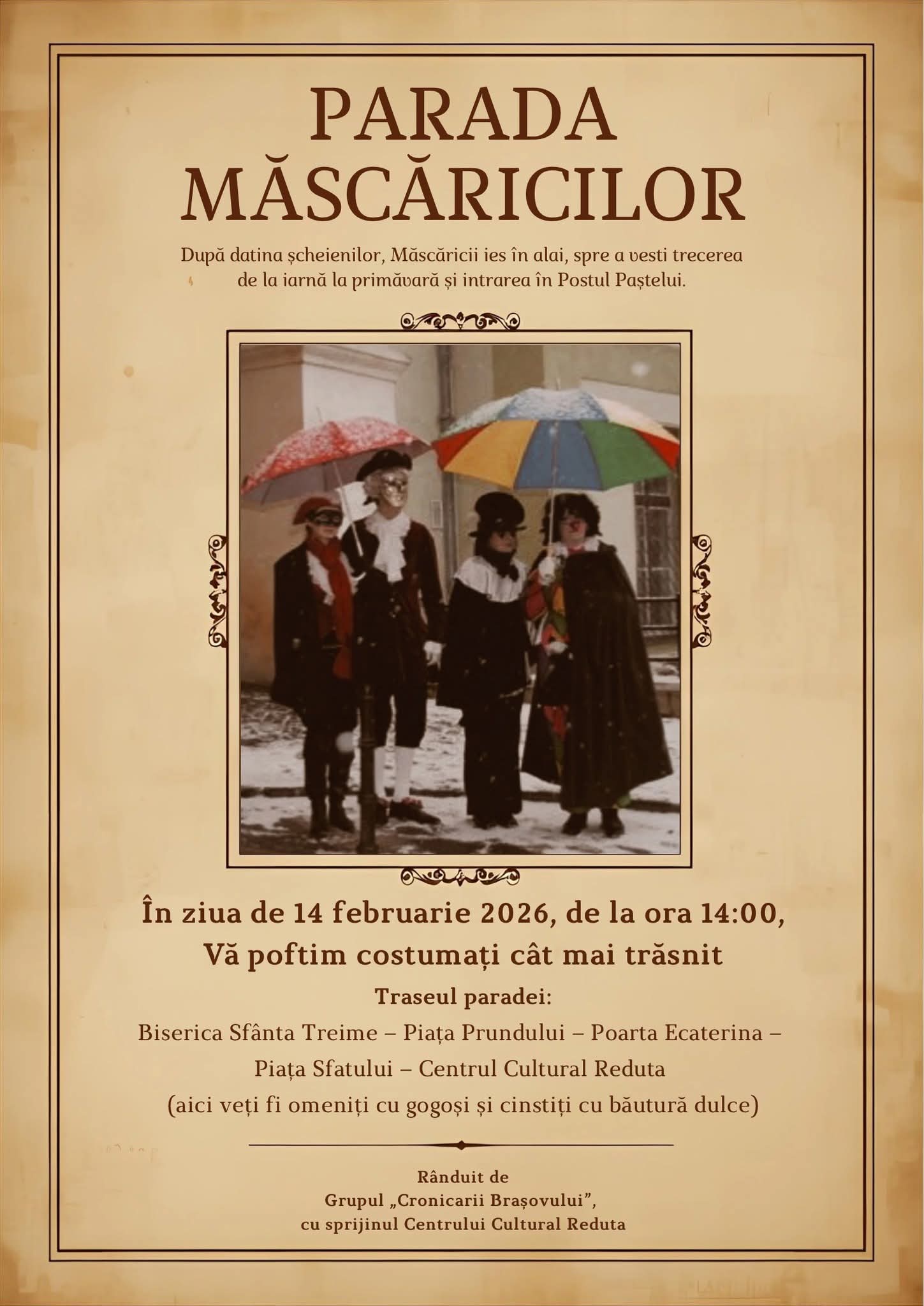 Parada Măscăricilor readuce în atenția brașovenilor o veche datină a Șcheilor Brașovului, legată de Lăsata Secului – momentul simbolic al trecerii de la iarnă la primăvară și al intrării în Postul Paștelui. Evenimentul va avea loc în data de 14 februarie, de la ora 14, când măscăricii vor ieși în alai pe traseul: Biserica Sfânta […]
