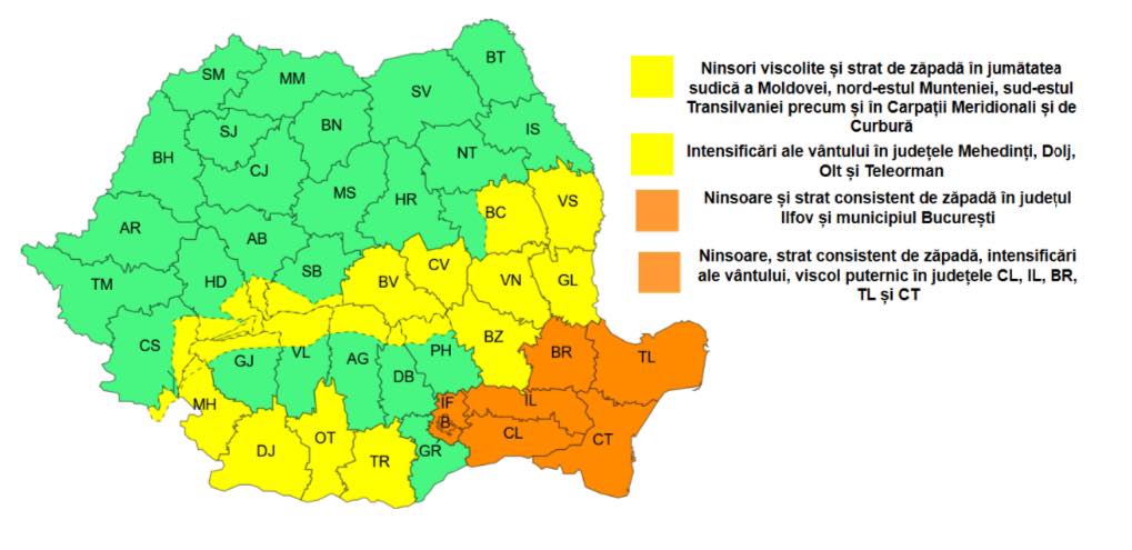 Meteorologii au prelungit avertizarea pentru 18 februarie, iar traficul rămâne dificil. Cod galben extins (18 februarie, 10:00 – 23:00) Cod portocaliu (18 februarie, 10:00 – 16:00) Cod portocaliu (18 februarie, 10:00 – 23:00) Recomandări importante: Condițiile meteo se pot schimba rapid, iar autoritățile monitorizează permanent situația pentru siguranța populației.