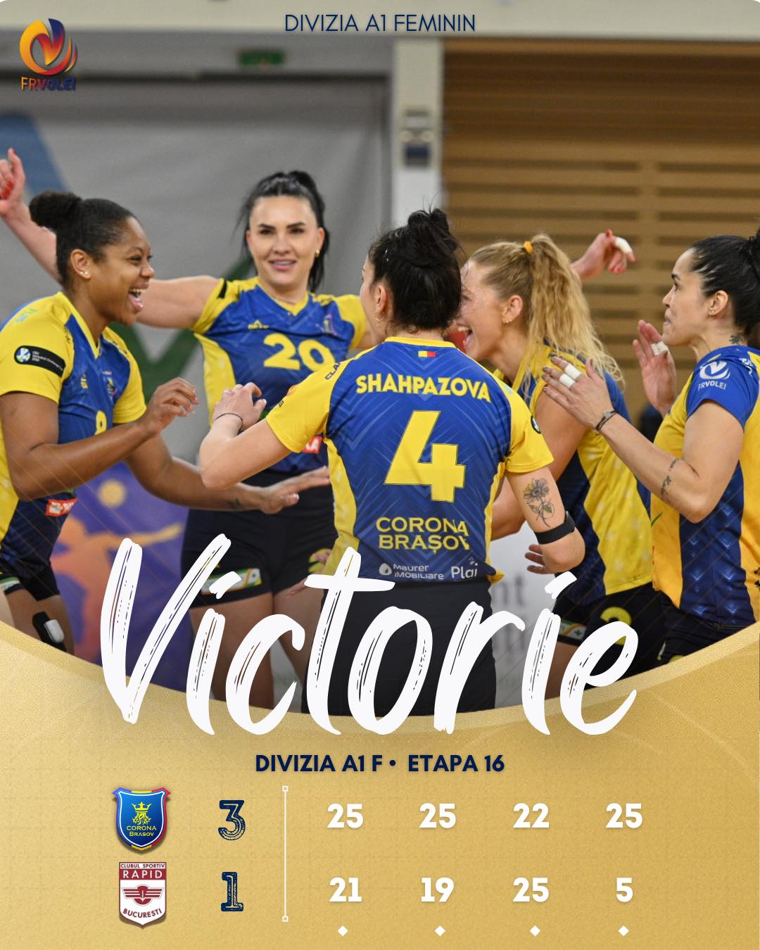 CSM Corona Brașov a învins-o pe CS Rapid București cu scorul de 3-1 (25-21, 25-17, 22-25, 25-5), duminică, în Sala Polivalentă ”Dumitru Popescu-Colibași”, într-un meci din etapa a 16-a a Diviziei A1 la volei feminin. Antrenorul secund, Răzvan Pătran, a precizat că în setul 3, pierdut de Corona, brașovencele au intrat puțin în jocul adversarei […]