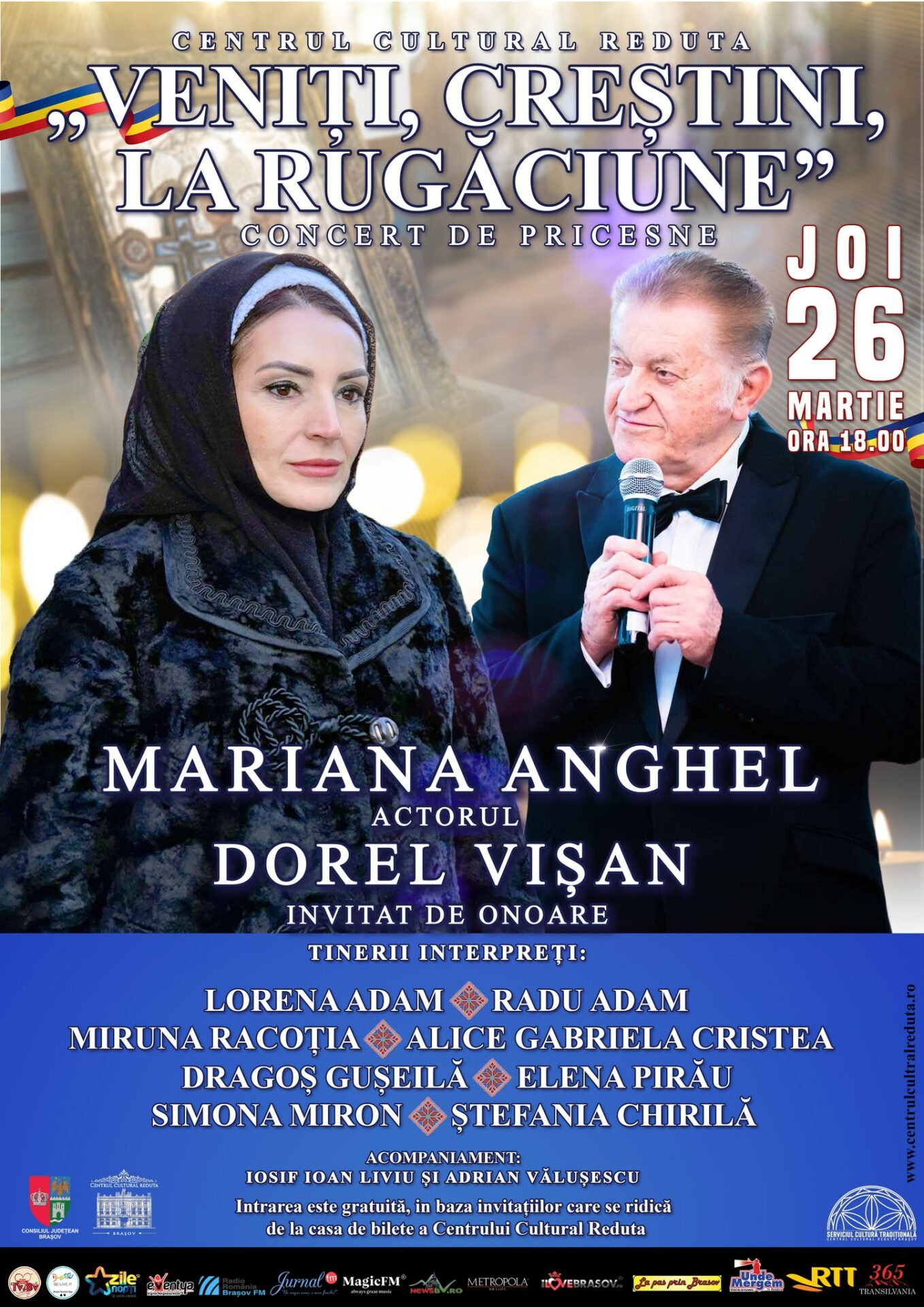 Centrul Cultural Reduta din Brașov invită publicul joi, 26 martie, de la ora 18:00, la un moment de suflet dedicat perioadei premergătoare Sfintelor Sărbători Pascale – concertul de pricesne „Veniți, creștini, la rugăciune!”. Evenimentul aduce pe scenă două personalități îndrăgite ale culturii române: interpreta Mariana Anghel și marele actor Dorel Vișan, invitat de onoare al […]