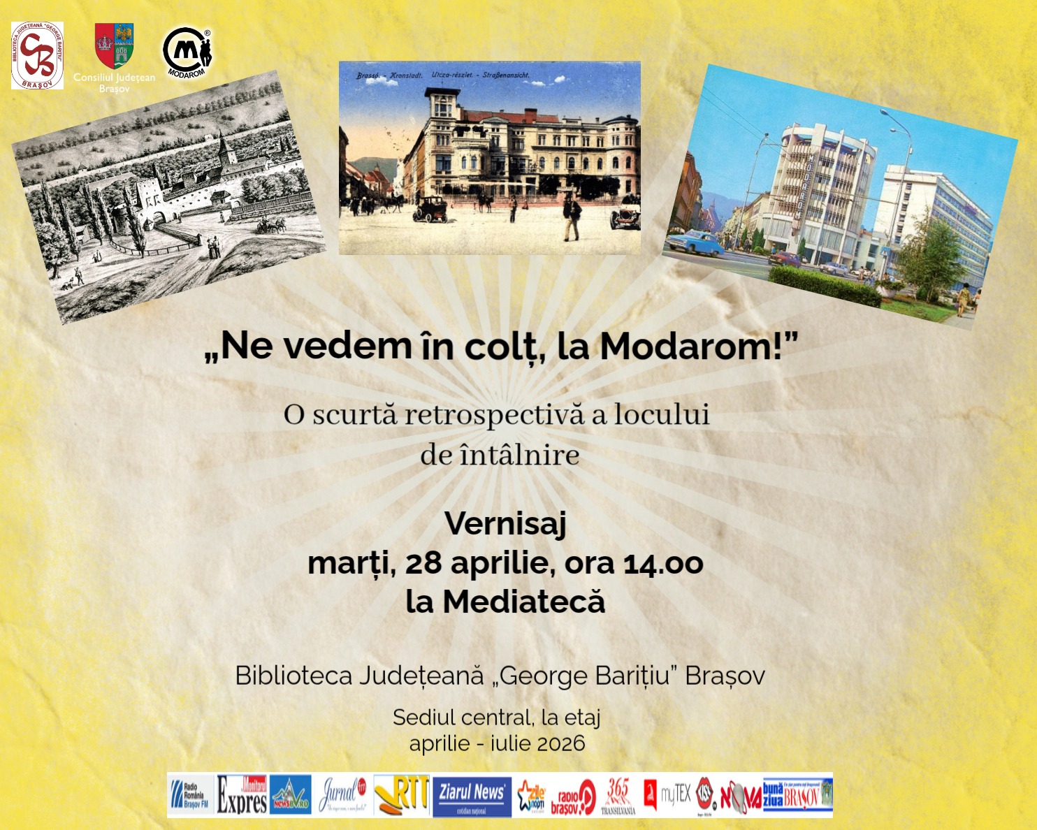 Așa sună doar titlul, pentru că vernisajul expoziției la care sunteți invitați va avea loc marţi, 28 aprilie 2026, ora 14,00 la Mediatecă, la etajul 1 al sediului central al Bibliotecii Județene Brașov, în Livada Poştei. ”Clădirea Modarom are un loc precis în geografia şi peisajul urban ale Braşovului. Ridicată pe locul unei foste porţi […]