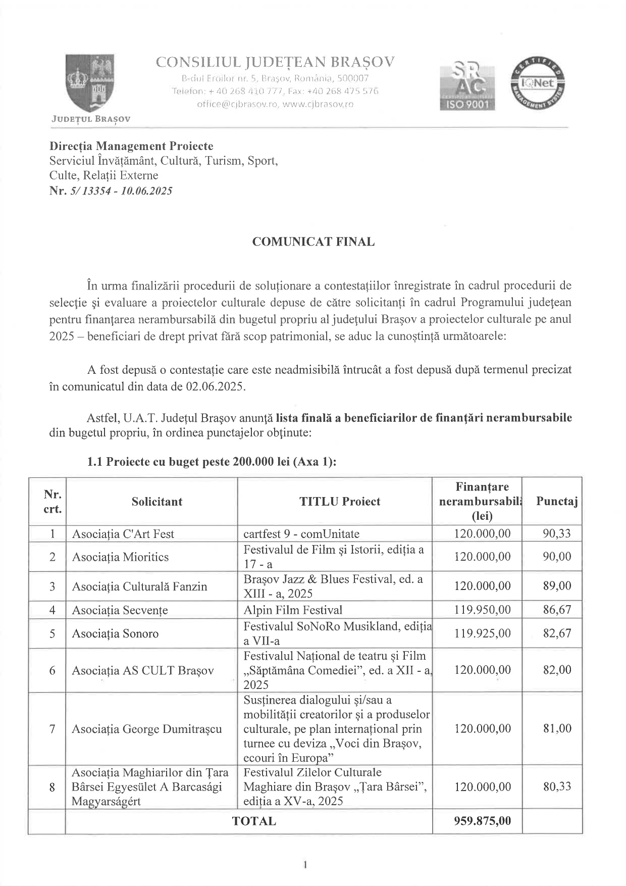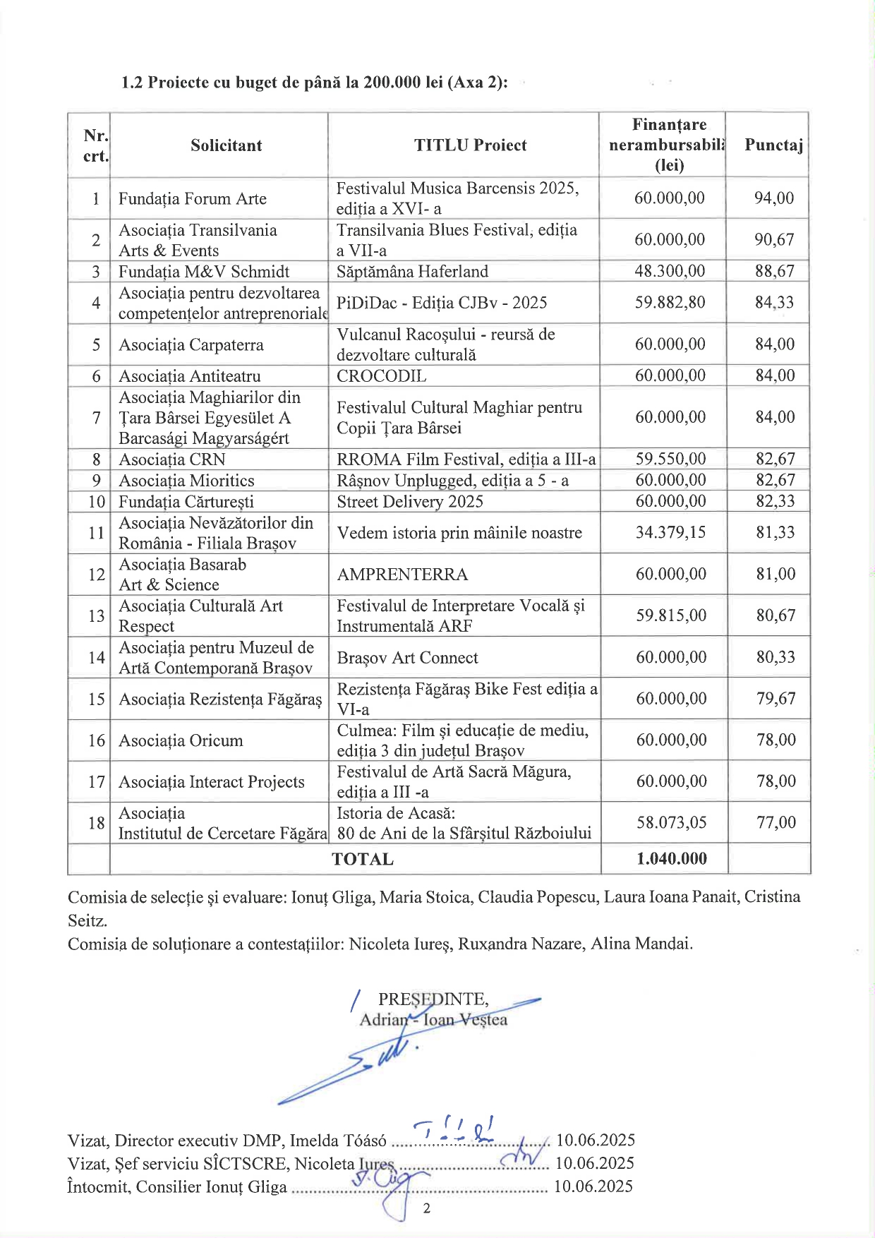 În urma soluționării contestațiilor înregistrate în urma procedurii de selecţie şi evaluare a proiectelor depuse pe Programul judeţean pentru finanţarea nerambursabilă din bugetul propriu al judeţului Braşov a proiectelor culturale pe anul 2025 – beneficiari de drept privat fără scop patrimonial, finanţăm 8 proiecte cu bugete mai mari de 200.000 de lei şi 18 proiecte ale căror bugete nu depăşesc plafonul de 200.000 de lei.