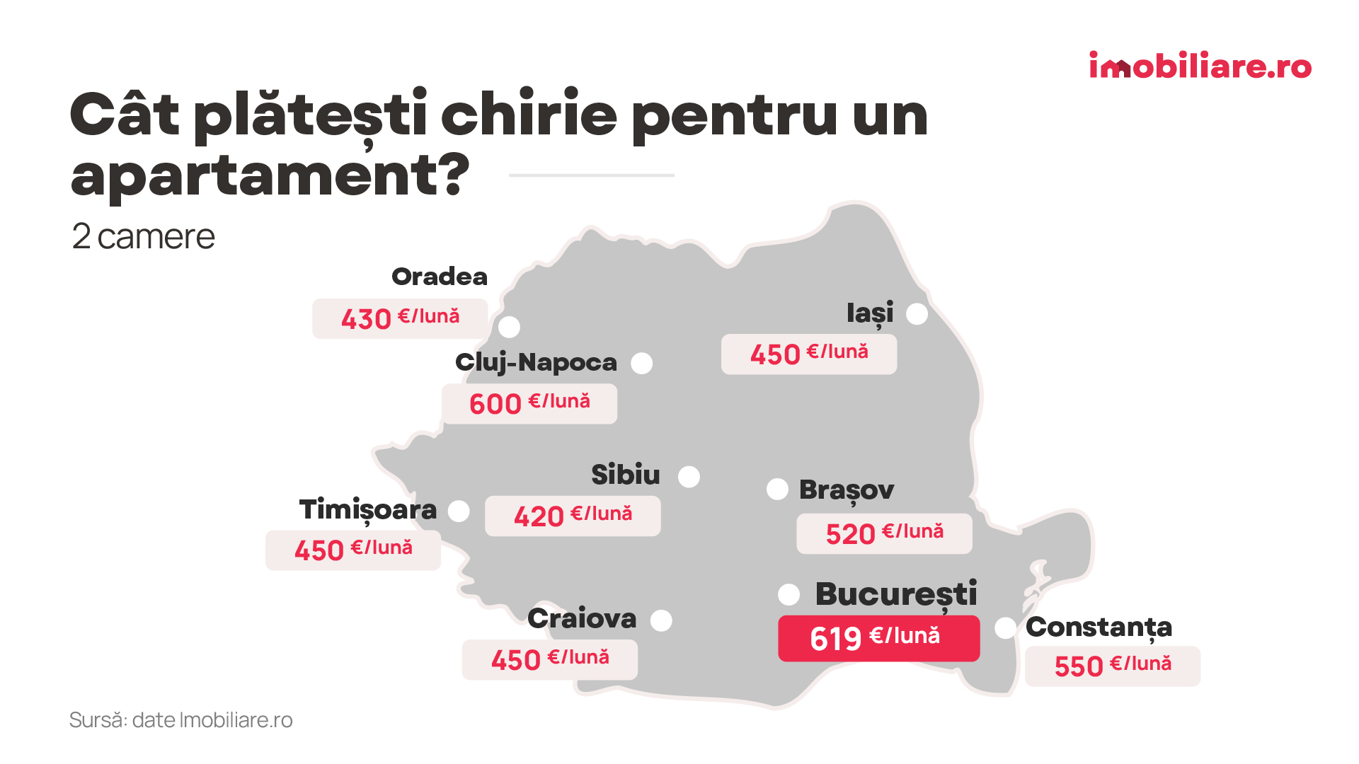 În cazul apartamentelor cu 2 camere, și ele extrem de căutate în rândul potențialilor chiriași, bugetul mediu necesar închirierii pornește de la 420-430 euro/lună în Sibiu și în Oradea. În Cluj-Napoca un chiriaș trebuie să se pregătească, în schimb, să achite lunar 600 euro pentru o astfel de locuință, în timp ce în București chiria medie pentru un apartament cu 2 camere ajunge la 619 euro/lună.