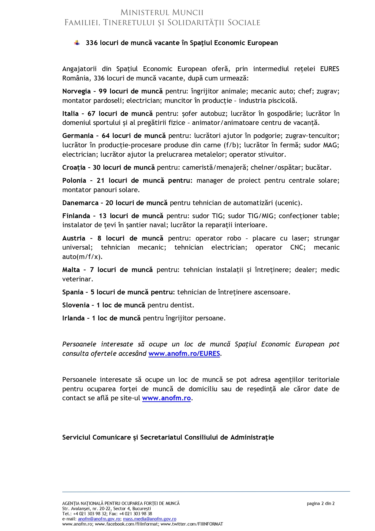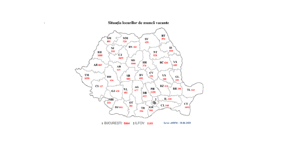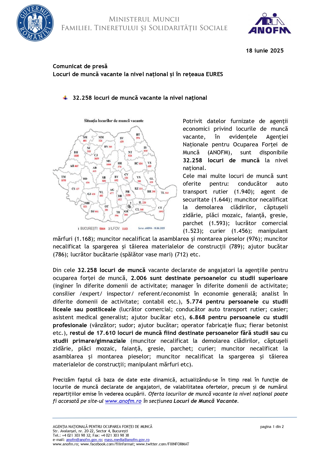 Potrivit datelor furnizate de agenţii economici privind locurile de muncă vacante, în evidenţele Agenţiei Naţionale pentru Ocuparea Forţei de Muncă (ANOFM), sunt disponibile 32.258 locuri de muncă la nivel naţional. De asemenea, angajatorii din Spaţiul Economic European oferă, prin intermediul reţelei EURES România, 336 locuri de muncă vacante.