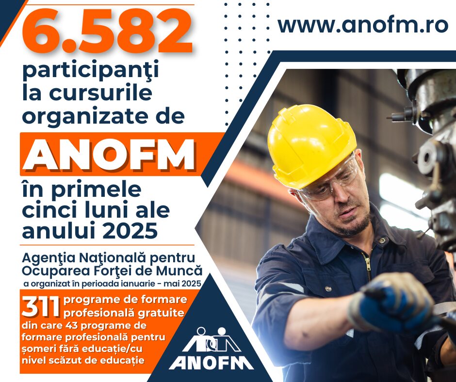 În perioada ianuarie – mai 2025, Agenţia Naţională pentru Ocuparea Forţei de Muncă (ANOFM) a cuprins în programele de formare profesională organizate prin intermediul centrelor regionale de formare profesională a adulţilor și centrelor proprii din cadrul agenţiilor teritoriale pentru ocuparea forţei de muncă 6.582 de persoane.