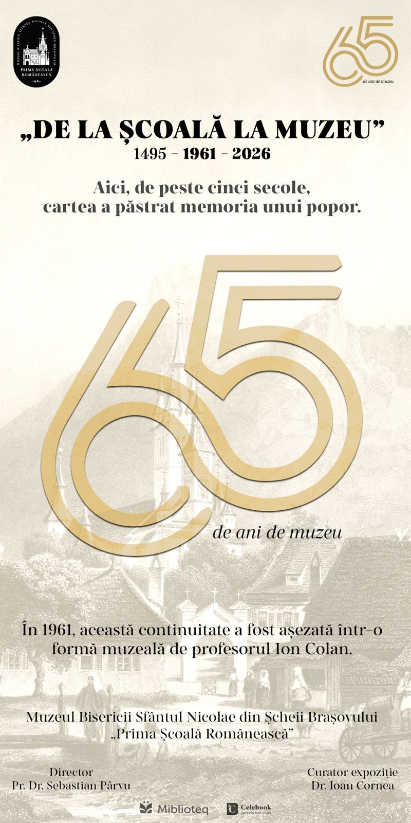 Un reper fundamental al identității culturale brașovene își celebrează istoria și continuitatea. La împlinirea a 65 de ani de la deschiderea Muzeul Prima Școală Românească, comunitatea este invitată să ia parte la un moment aniversar cu puternică încărcătură simbolică, sub titlul „De la școală la muzeu”.