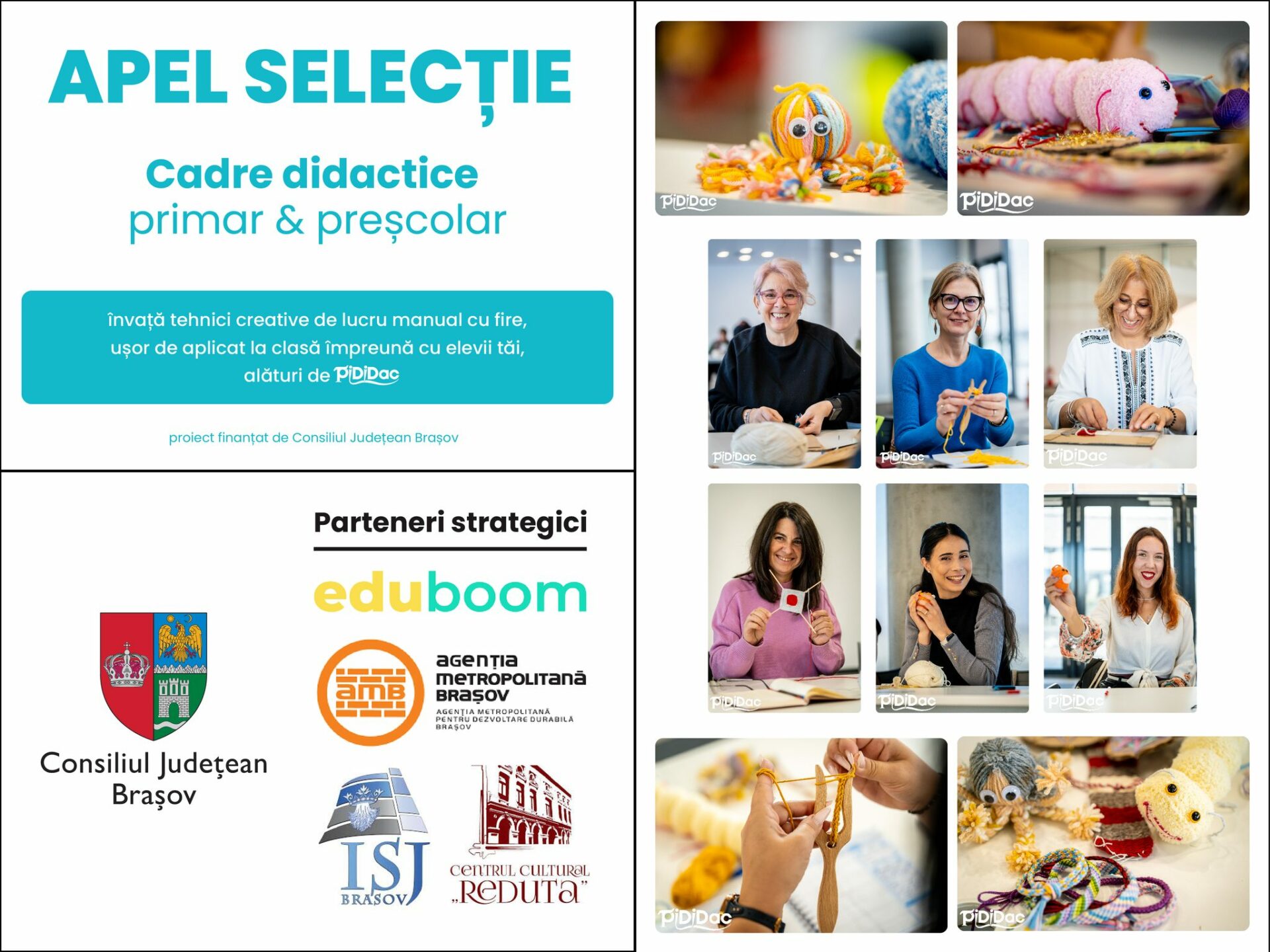 Asociaţia pentru Dezvoltarea Competenţelor Antreprenoriale a iniţiat proiectul „PiDiDac – Ediţia CJBv 2025” al cărui obiectiv este ca 80 de cadre didactice din județul Brașov să înveţe tehnici creative de lucru manual cu fire de la meșterul artizan Gabriela Bularca, pentru a le aplica direct la clasă, ca metodă practică și atractivă de predare.