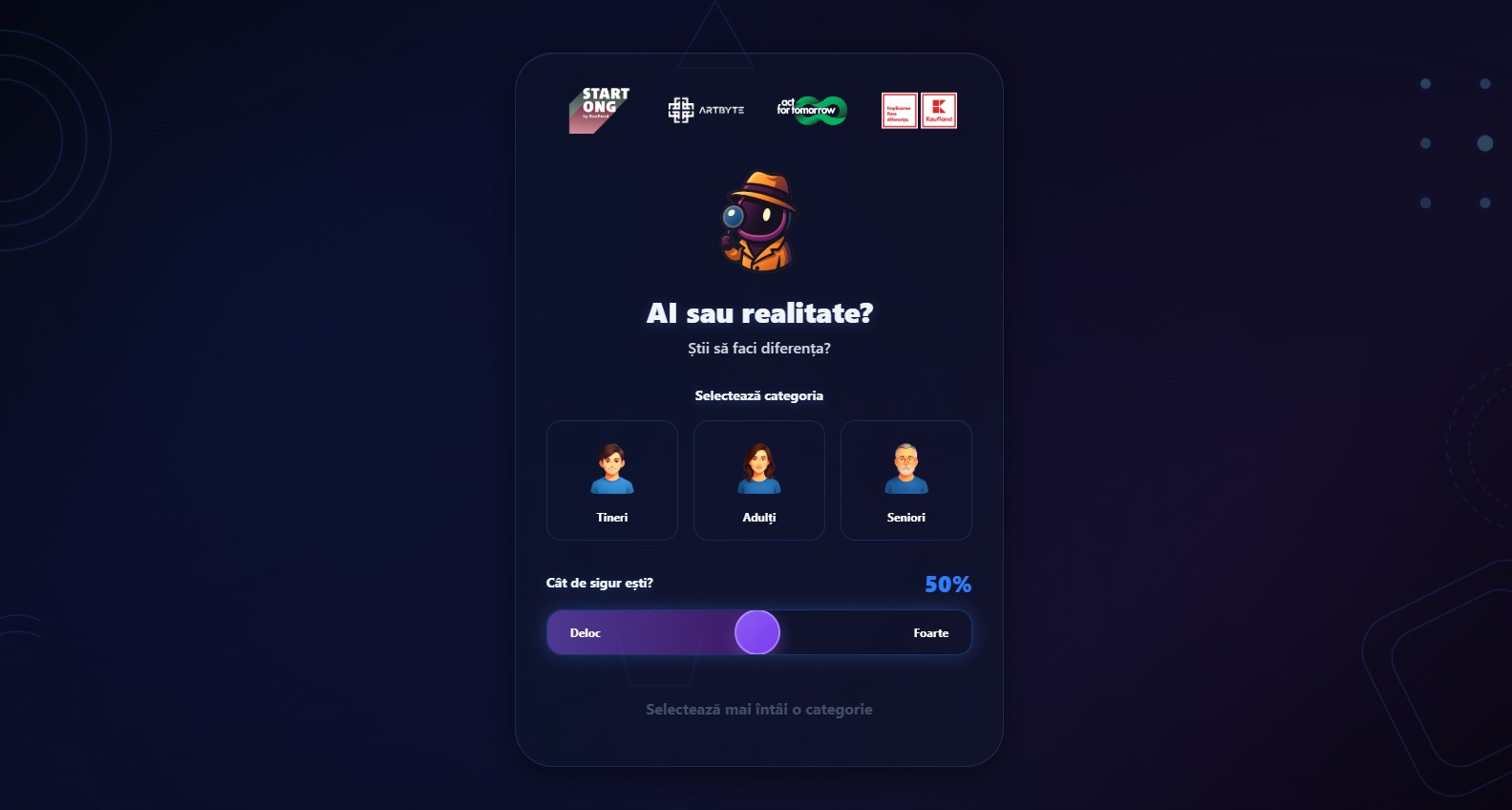 DetectivulAI.ro combină exemple vizuale reale, explicații accesibile și un test interactiv prin care utilizatorii își pot exersa „ochiul digital”. Platforma este actualizată constant cu imagini, indicii și situații din lumea reală pentru ca oamenii să înțeleagă nu doar cum arată un deepfake, ci și de ce funcționează, de ce păcălește creierul și cum poate fi identificat. Platforma este construită cu conținut adaptat pe categorii de vârstă, astfel încât adolescenții, adulții și seniorii să poată exersa diferențierea dintre real și fals în funcție de nivelul lor de experiență digitală. După accesarea platformiei, utilizatorii parcurg un test rapid în care li se prezintă imagini, texte și exemple audio, apoi trebuie să răspundă la întrebarea: „Este real sau creat de AI?” La final, fiecare participant primește atât un scor individual, cât și explicații despre indiciile care trădează conținutul artificial.