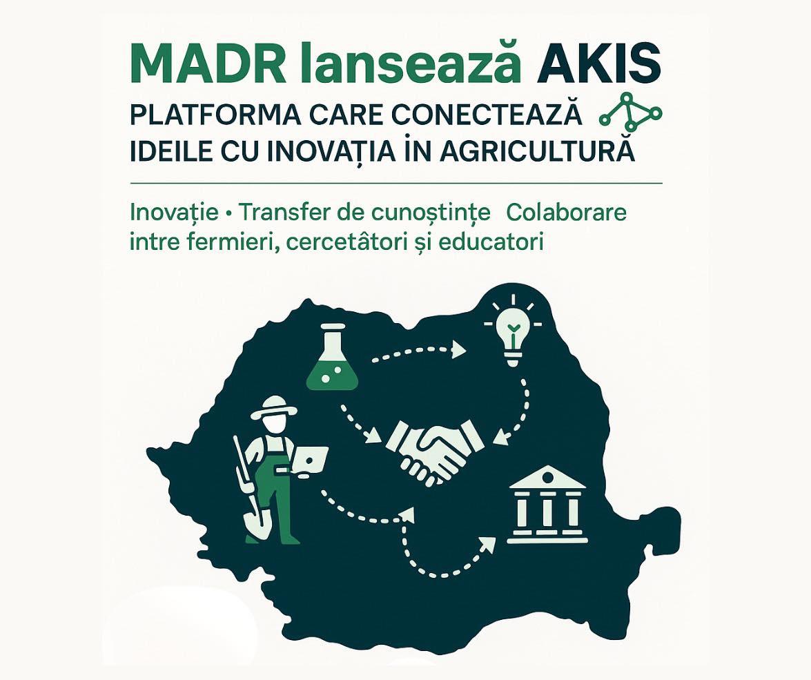 Ministerul Agriculturii si Dezvoltarii Rurale a lansat platforma națională AKIS (Sistemul de Inovare și Cunoaștere în Agricultură), un instrument digital care oferă un cadru colaborativ pentru generarea, transferul şi aplicarea cunoștințelor și inovațiilor.