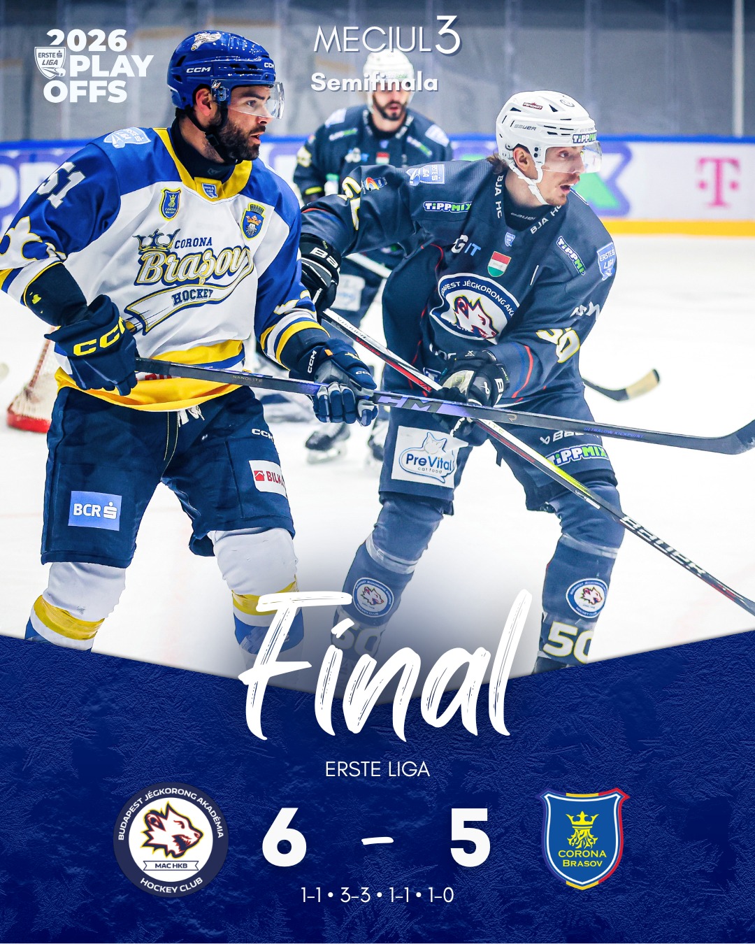 În cealaltă semifinală, Corona Brașov a cedat dramatic în fața formației Budapest Jegkorong Akademia HC, scor 5-6, după prelungiri.