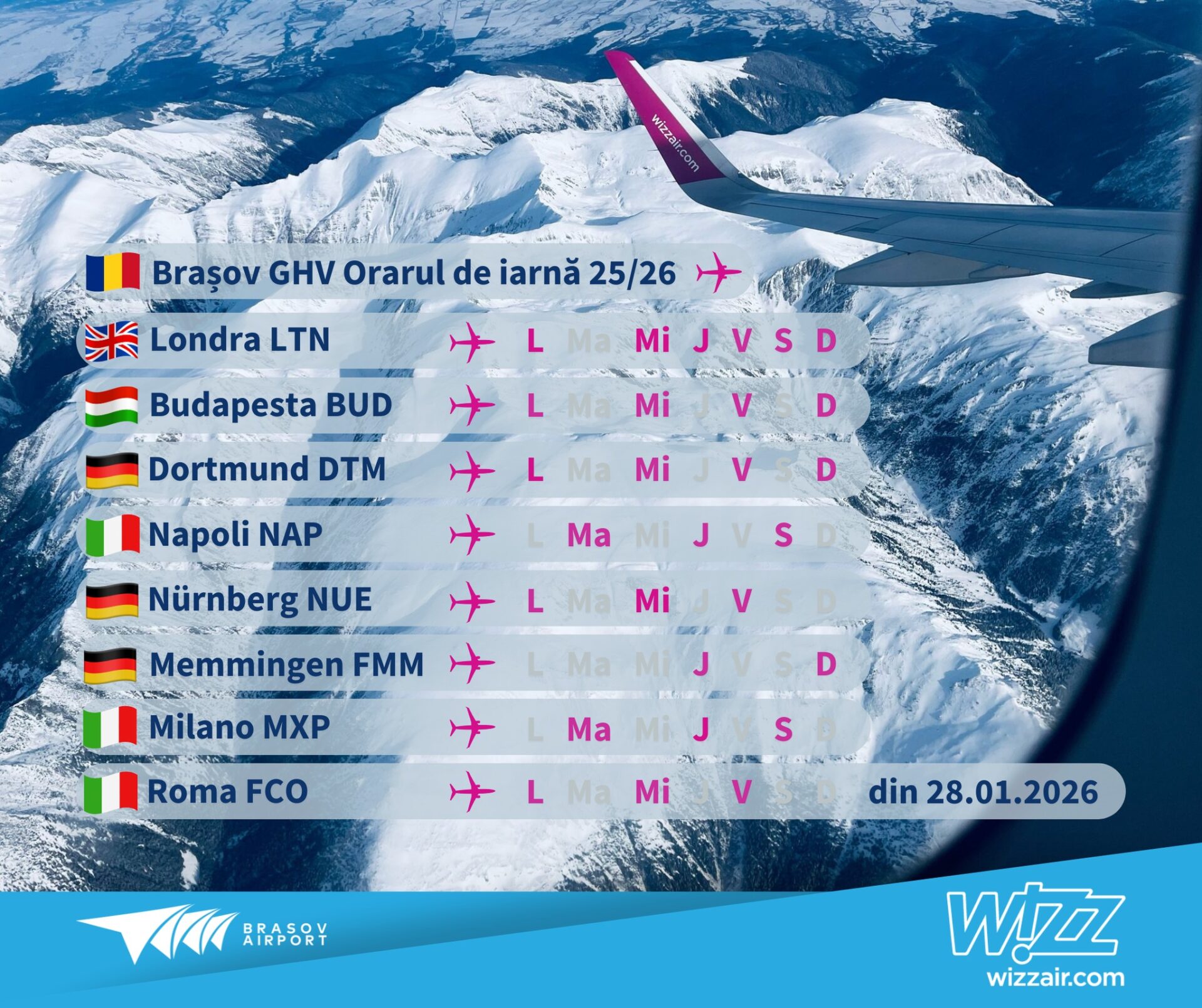 Aeroportul Internațional Brașov–Ghimbav anunță modificări importante în orarul de iarnă 2025–2026, valabile în perioada 15 decembrie 2025 – 11 ianuarie 2026. Operatorul aerian Wizz Air a decis să crească frecvența zborurilor pe patru dintre cele opt destinații disponibile, ca răspuns la cererea ridicată din sezonul sărbătorilor de iarnă.