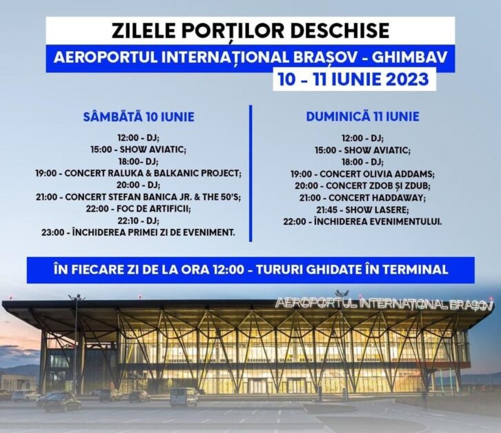 Publicul a fost întâmpinat cu muzică și s-a bucurat de tururi ghidate prin aeroport, dar și pe pistă, în prima parte a zilei. Evenimentul include spectacole aviatice, concerte, focuri de artificii, iar fiecare vizitator primeşte un tichet de îmbarcare simbolic.