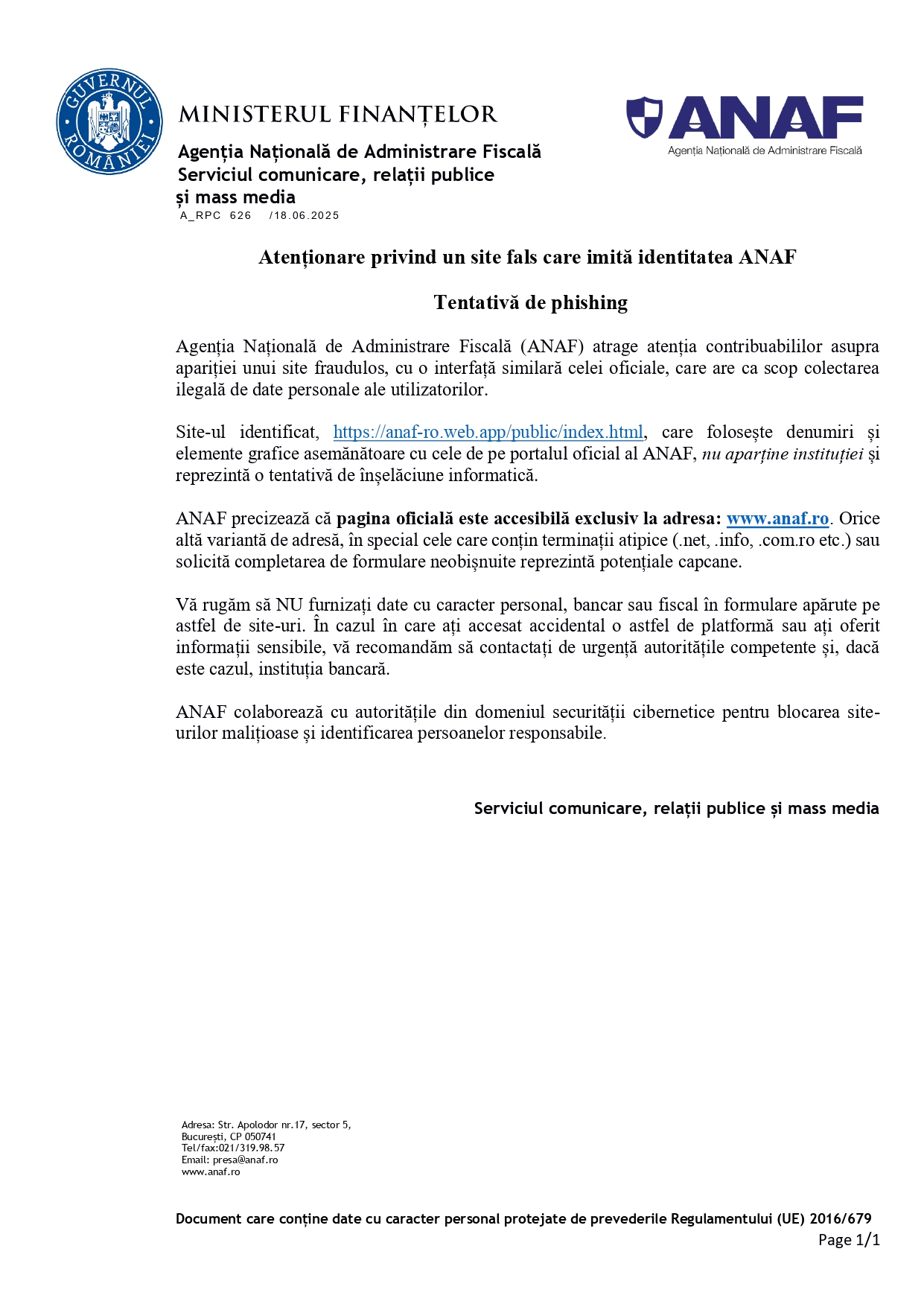 Site-ul identificat, https://anaf-ro.web.app/public/index.html, care foloseşte denumiri şi elemente grafice asemănătoare cu cele de pe portalul oficial al ANAF, nu aparţine instituţiei şi reprezintă o tentativă de înşelăciune informatică.