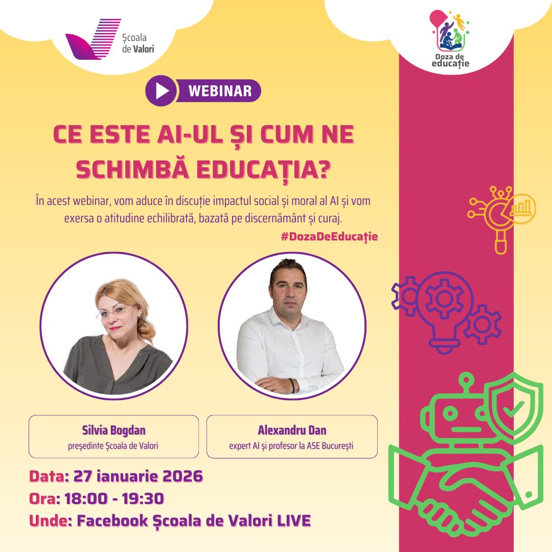 Școala de Valori vă invită să participați în această seară la webinarul din seria Doza de Educație: „Ce este AI-ul și cum ne schimbă educația?”, un spațiu de reflecție și dialog pentru cadrele didactice și liderii educaționali. Evenimentul va avea loc pe 27 ianuarie 2026, de la ora 18:00, pe pagina de Facebook a Școlii […]