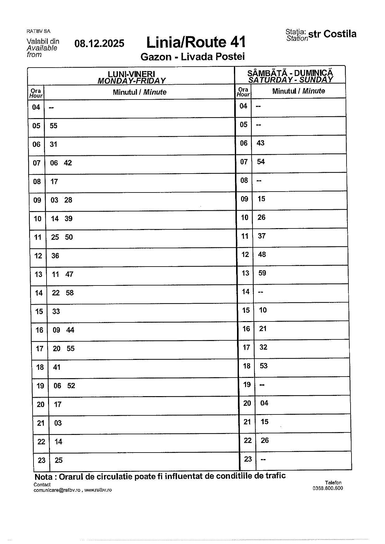 Începând de astăzi, 8 decembrie, autobuzele de pe traseul urban RATBV cu indicativul 41 (Livada Poștei – Stupinii Noi/Gazon) vor opri într-o nouă pereche de stații, denumite ”Coștila”, situate pe strada Plugarilor, între punctele de îmbarcare / debarcare ”Cimitirul Central” și ”Stație Epurare”.