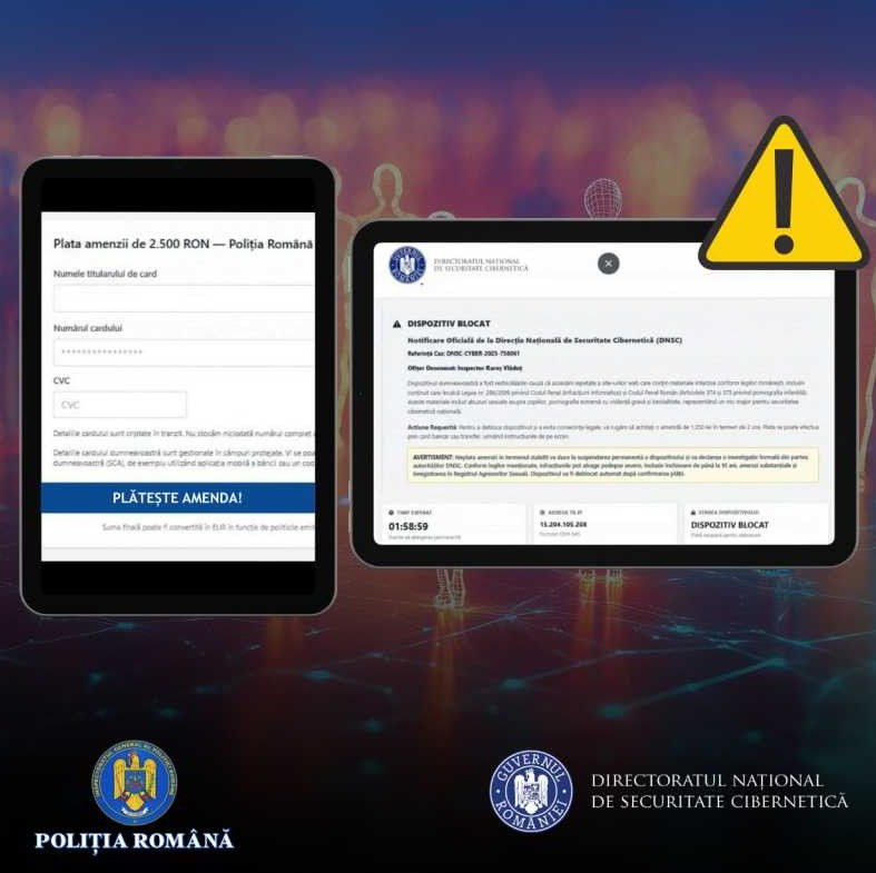 „Ulterior, după ce este impacientat de notificarea falsă, utilizatorul este redirecționat către un portal de plată unde este afișat logo-ul Directoratului și prin care sunt solicitate datele de card. Pentru a debloca dispozitivul și pentru a evita presupusele consecințe legale, utilizatorului i se solicită achitarea unei amenzi (care poate varia de la 1.250 RON la 2.500 RON), într-un termen foarte scurt, de regulă două ore. Autoritățile române nu blochează dispozitive prin astfel de mesaje și nu solicită plata amenzilor prin pagini web, pop-up-uri sau sub presiunea timpului. Orice astfel de notificare trebuie ignorată și raportată, pentru a preveni ca alți cetățeni de bună-credință să devină victime”, avertizează sursa citată.