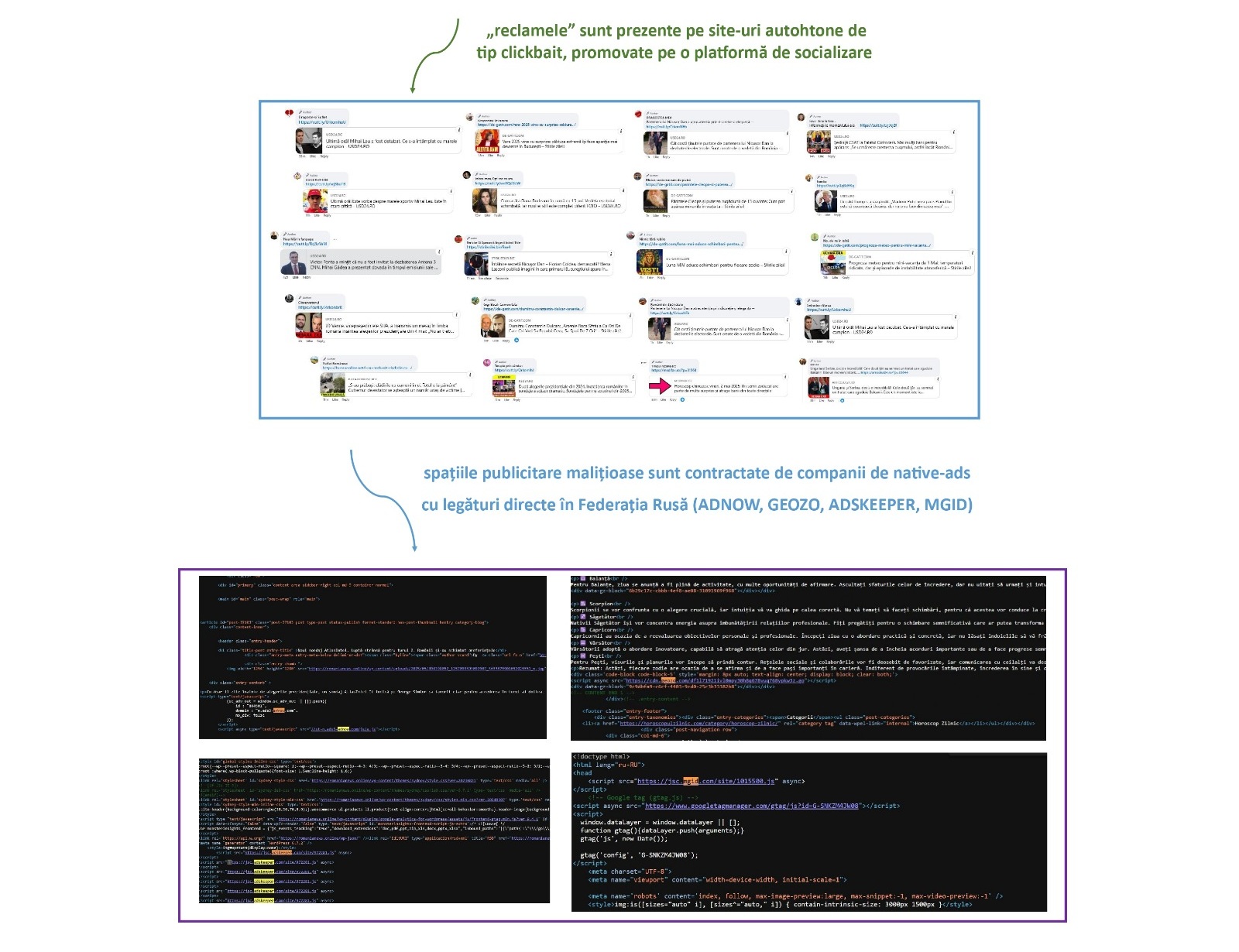 Reclamele malițioase se prezintă sub forma unor titluri false de știri, spațiile publicitare în care acestea sunt postate fiind contractate de companiile de publicitate care utilizează tehnologia “native ads” – Adskeeper, Geozo, Adnow și MGID, semnalate anterior în spațiul public pentru legături directe cu Federația Rusă. Spre exemplu, compania Adnow este subiectul unor investigații extinse în alte state membre, dar și în România pentru implicarea în operațiuni informaționale în favoarea serviciilor de informații ale Federației Ruse.