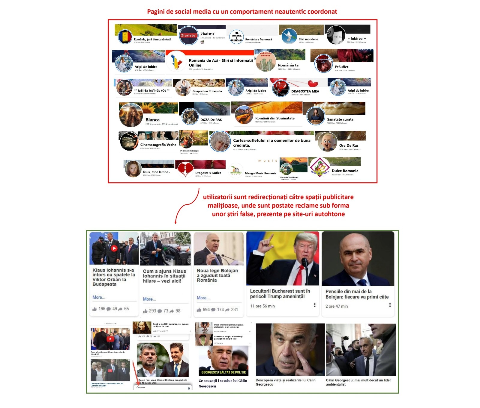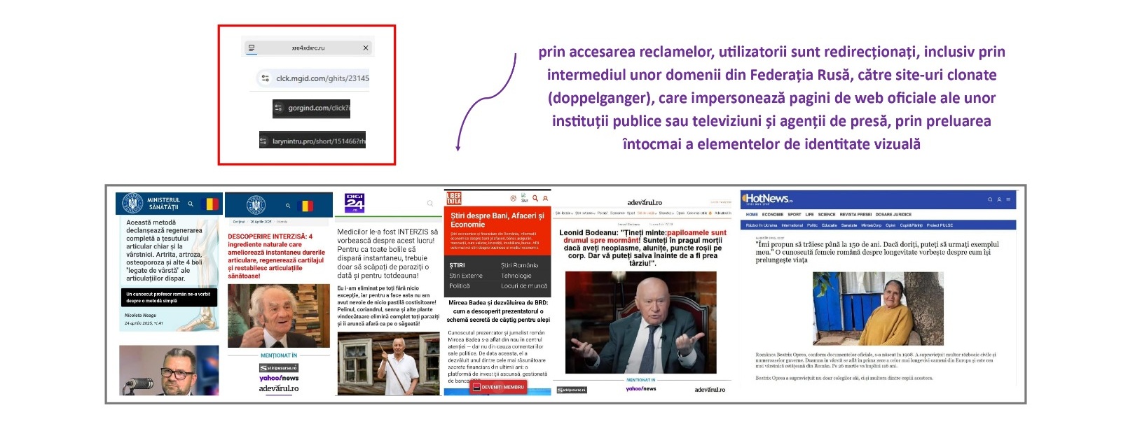 În cadrul acestui ecosistem au fost identificate link-uri care redirecționează utilizatorii către paginile clonate menționate anterior, prin intermediul unor reclame malițioase, utilizate drept “trambuline”, prezente pe site-uri autohtone, în special de tip clickbait (ex: cezicelumea.ro, surse.eu, stiricalitative.ro, dromania.ro, redactia.ro, viralnews.ro, lendermagazin.ro etc.).