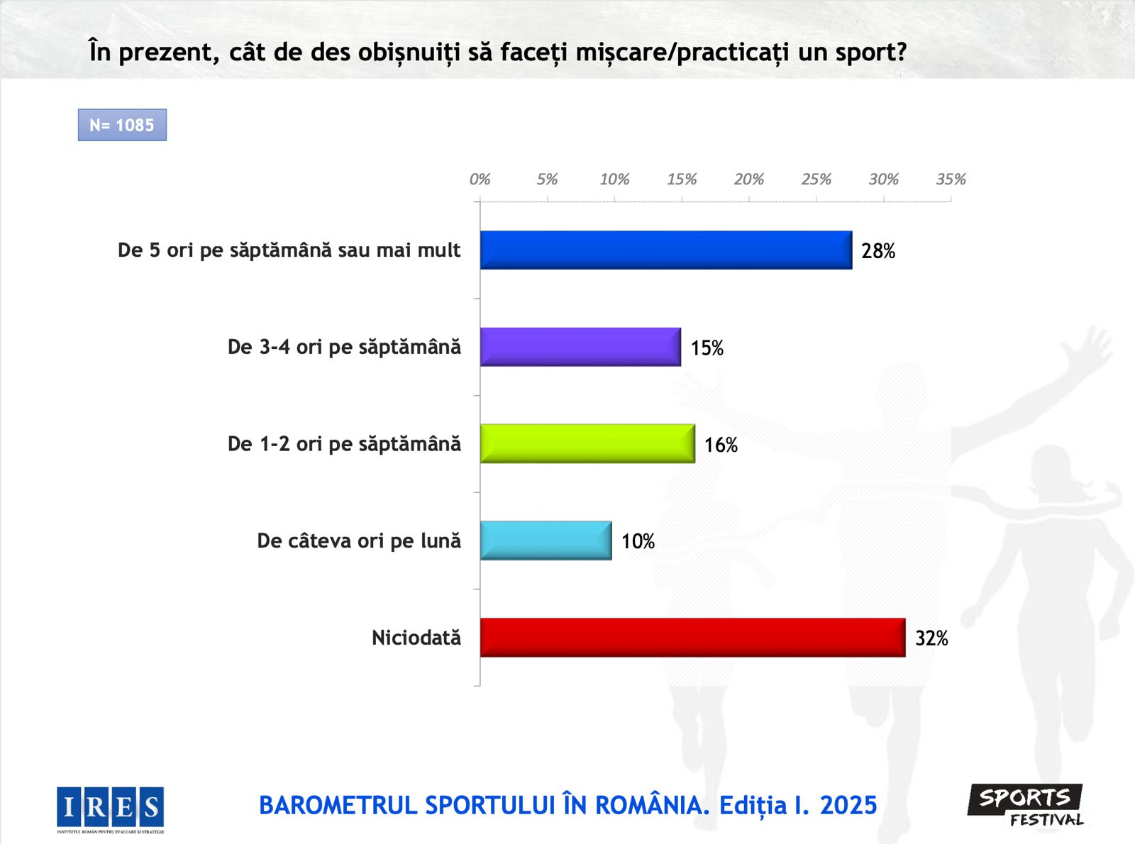 - 32% dintre români declară că nu fac deloc sport, iar 28% spun că practică activități sportive de cel puțin 5 ori pe săptămână;