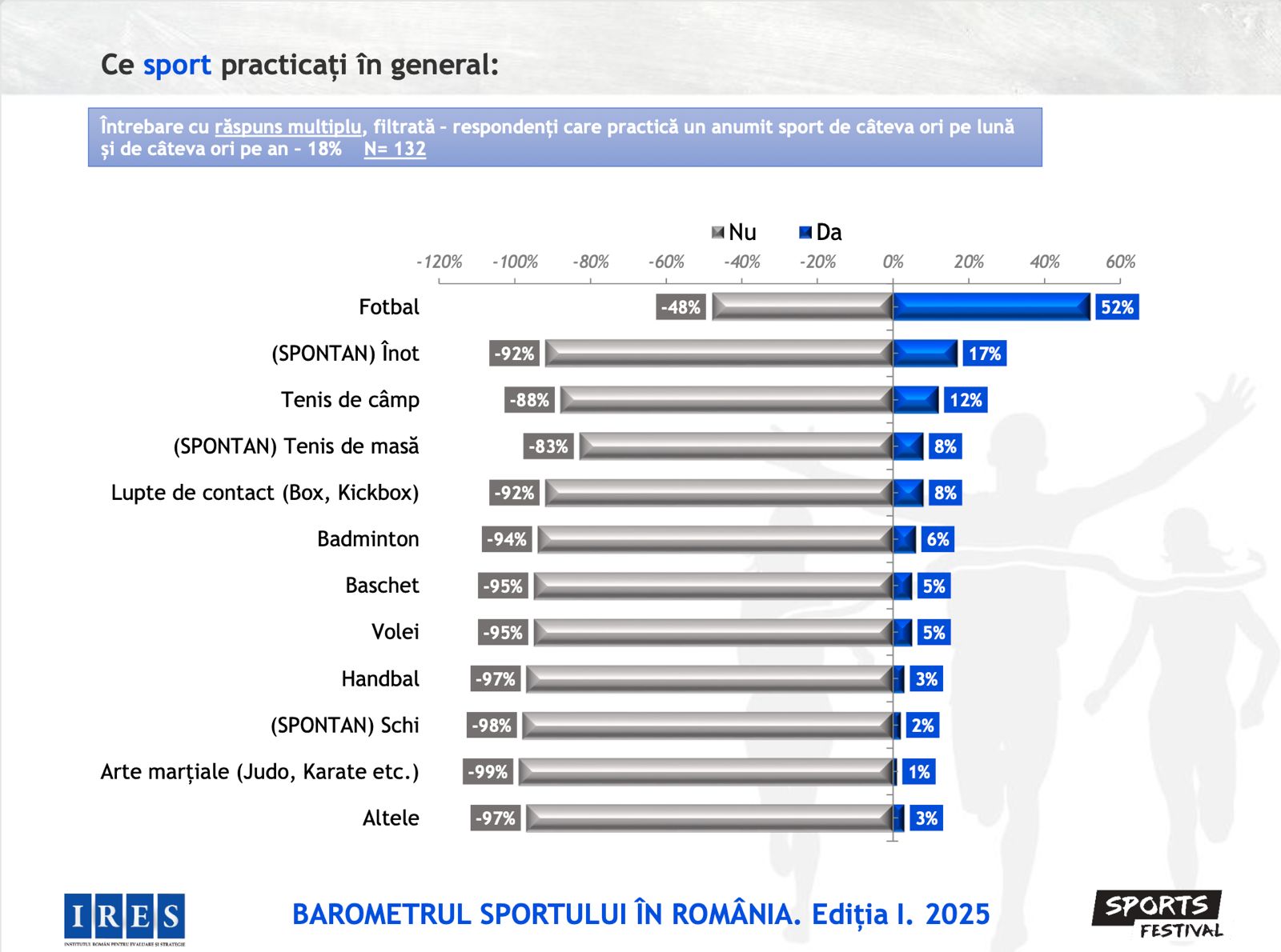 - Fotbalul este cel mai practicat sport în România – 52% dintre cei care practică un sport în mod regulat îl aleg;