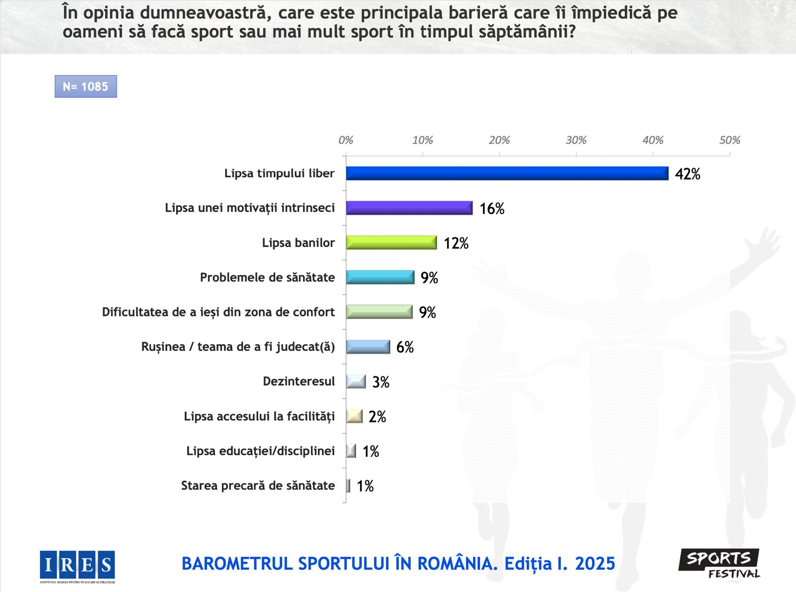 Barometrul Sportului în România a fost lansat joi, 12 iunie, în cadrul Sports Festival, în deschiderea sesiunilor Sports Talks 2025. Studiul, realizat de IRES (Institutul Român pentru Evaluare și Strategie), scoate la iveală cifre revelatoare: 32% dintre români aproape jumătate dintre români nu fac niciun tip de activitate fizică sport deloc, iar odată cu înaintarea în vârstă, motivația scade drastic. Însă un procent ridicat de persoane care nu fac niciun fel de activitate fizică se remarcă și în rândul respondenților între 36 și 50 de ani. Cei mai mulți dintre românii care nu fac sport sau mișcare declară că nu au timp pentru aceste activități, dar când e vorba despre ceilalți, cred că pur și simplu nu au voință.