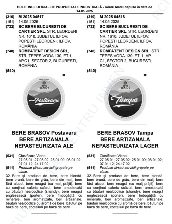 Caz alarmant în registrul mărcilor OSIM: două cereri recente de înregistrare depuse de o firmă din județul Ilfov, SC Bere București de Cartier SRL, urmăresc să obțină protecția exclusivă pentru mărcile „Bere Brașov Postăvaru” și „Bere Brașov Tampa”, fără ca aceasta să aibă vreo legătură economică, istorică sau geografică cu municipiul Brașov.