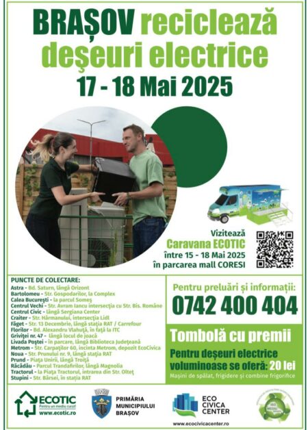 În perioada 17 – 18 mai 2025, locuitorii municipiului Brașov sunt invitați să participe la campania de conștientizare și colectare a deșeurilor de echipamente electrice și electronice (DEEE), organizată sub titlul „Brașov Reciclează”. Acțiunea este derulată de Asociația ECOTIC, în parteneriat cu Primăria Municipiului Brașov, Asociația de Dezvoltare Intercomunitară ISO Mediu și Eco Civica Center.