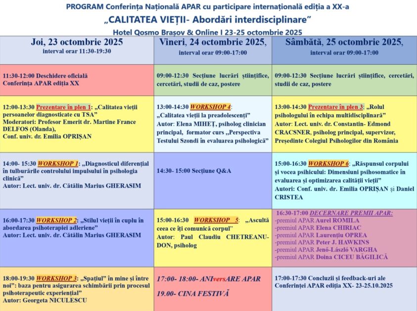 Brașovul devine, în aceste zile, gazda celei de-a XX-a ediții a Conferinței Naționale APAR cu participare internațională, desfășurată sub tema „Calitatea vieții – Abordări multidisciplinare”. Evenimentul marchează 20 de ani de excelență și reunește specialiști din diverse domenii, oferind o platformă științifică de dialog, cercetare și formare profesională continuă.