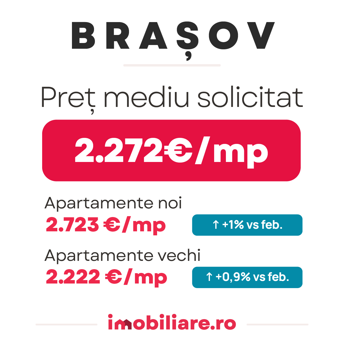 Brașov: Apartamentele noi din Brașov se vând cu un preț mediu de 2.723 euro/mp util, după un avans cu 1% în ultima lună. Pe plan local se poate observa o frânare puternică în evoluția prețurilor, odată cu reducerea apetitului investițional în contextul economic actual. În comparație cu începutul primăverii trecute prețurile au fost majorate cu 9% față de 18% în intervalul similar anterior. În perioada martie 2025-martie 2024, scumpirile înregistrate pe segmentul nou erau cele mai mari observate în rândul principalelor centre urbane monitorizate prin Indicele Imobiliare.ro.