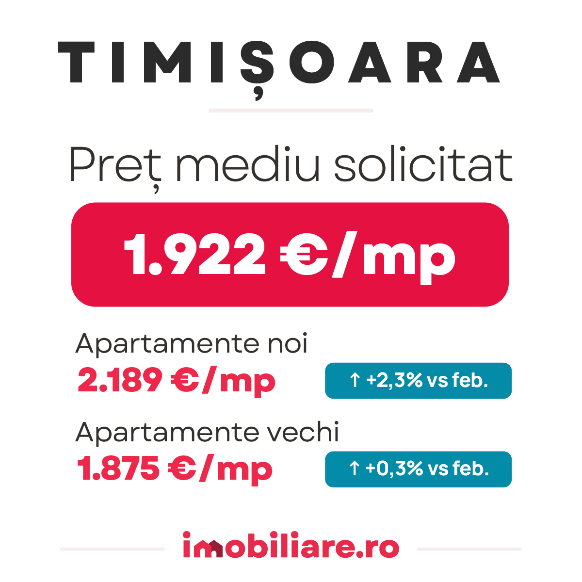 Timișoara: Prețurile avansează rapid pe segmentul nou al pieței rezidențiale și în Timișoara. Pe parcursul lunii trecute s-a înregistrat o medie de 2.189 euro/mp util, după un avans care a depășit ușor 2% față de februarie, cel mai consistent consemnat de Indicele Imobiliare.ro în rândul centrelor urbane majore monitorizate. Într-un an, cumpărătorii au ajuns să achite cu 12% mai mult pentru a face o achiziție imobiliară într-un bloc nou.