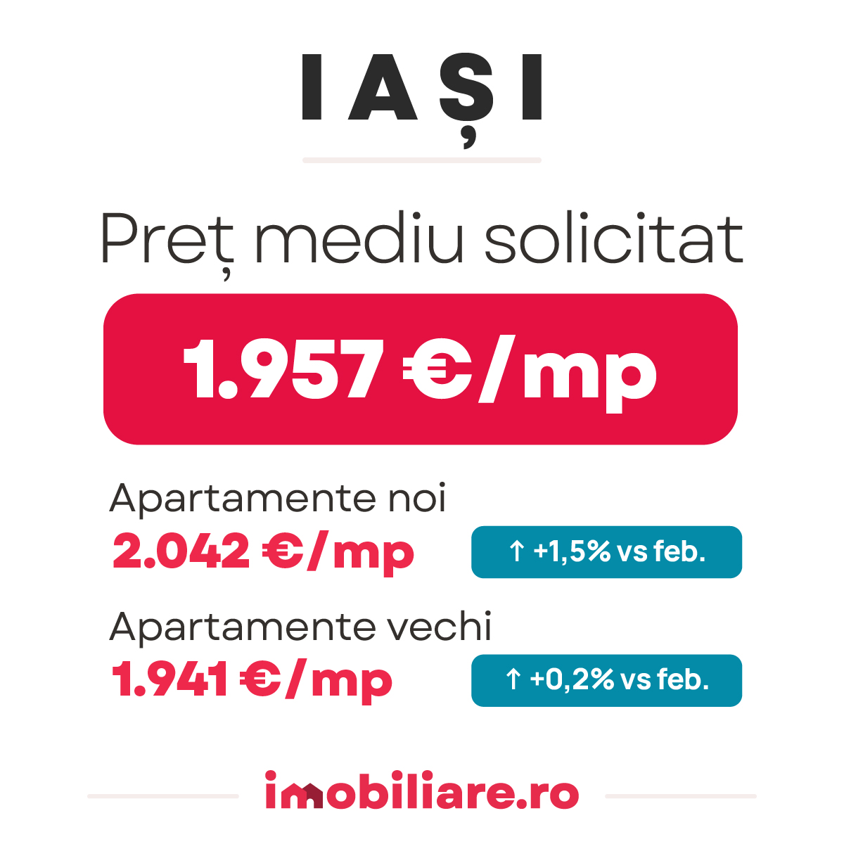 În perioada similară anterioară pe plan local majorările se mențineau sub 10%. Această evoluție este influențată de modificările apărute la nivelul ofertei. Dezvoltatorii imobiliari continuă extinderea unor proiecte ample și scot la vânzare unități noi cu un preț mediu mai mare decât cel înregistrat în urmă cu doi ani. În luna martie a anului 2024, apartamentele noi din Iași puteau fi cumpărate cu 1.629 euro/mp util.