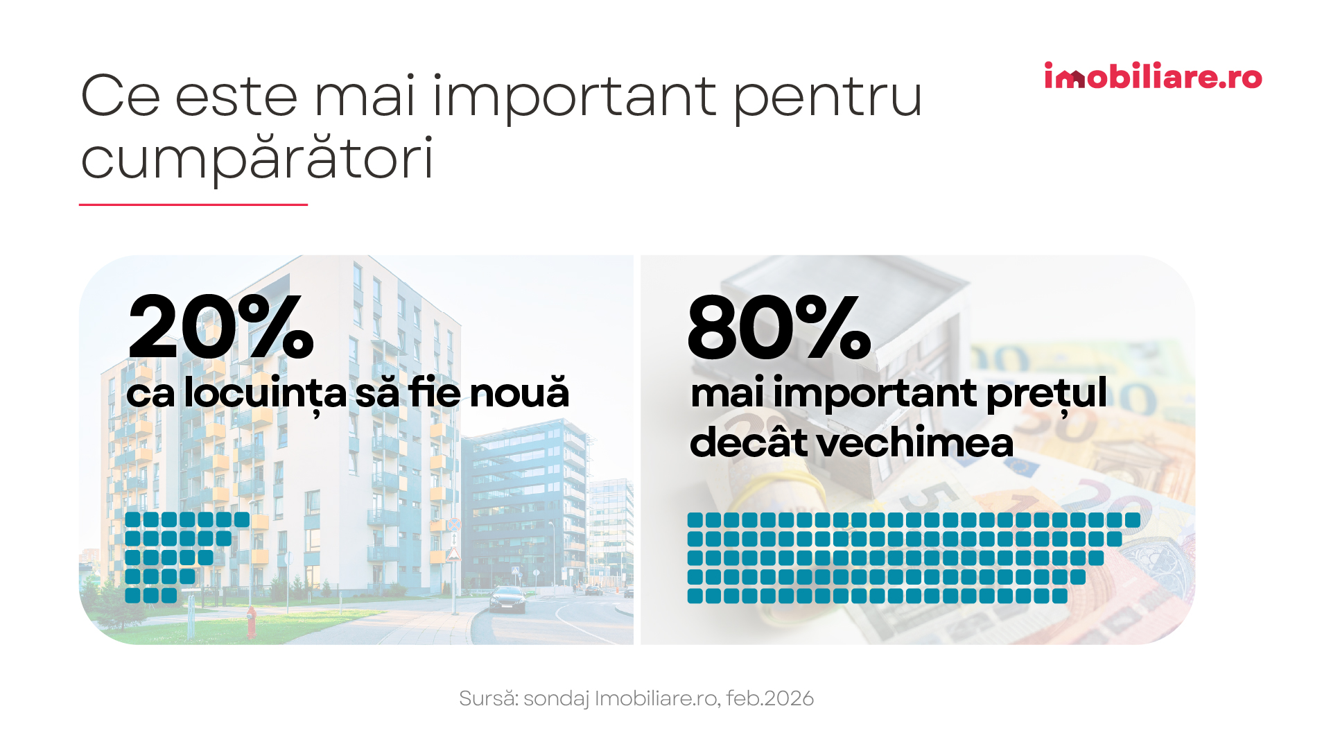 Sondajul Imobiliare.ro a fost realizat, în luna februarie 2026, în rândul potențialilor cumpărători interesați de realizarea unei achiziții imobiliare în principalele șase centre urbane din România (București, Brașov, Cluj-Napoca, Constanța, Iași, Timișoara) sau în localitățile situate la periferia acestora. Aproape 450 de persoane au luat parte la sondaj.