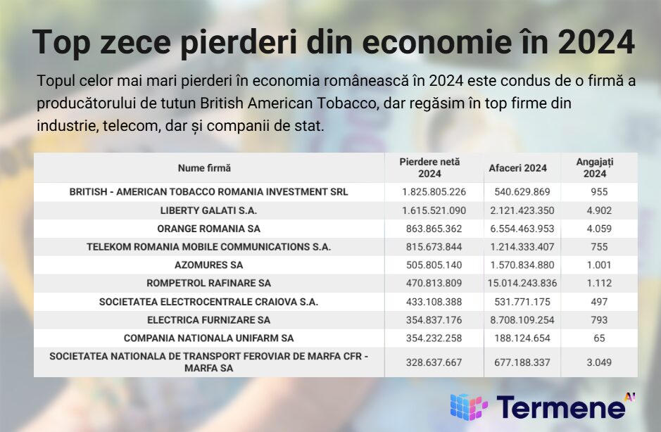 Topul celor mai mari pierderi din România este condus de această firmă a British American Tobacco, dar pe locul doi se situează Liberty Galați, cu o pierdere netă de peste 1,6 mld. lei în 2024, dintre cele aproape 800.000 de firme care au depus bilanțul pe anul 2024.