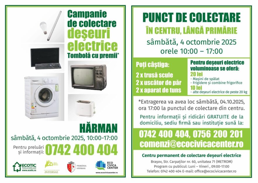 Sâmbătă, 4 octombrie 2025, locuitorii din Hărman sunt invitați să participe la o acțiune de colectare a deșeurilor electrice și electronice, organizată de Organizația ECOTIC, Asociația de Dezvoltare Intercomunitară Intersal, Primăria Hărman și Eco Civica Center.