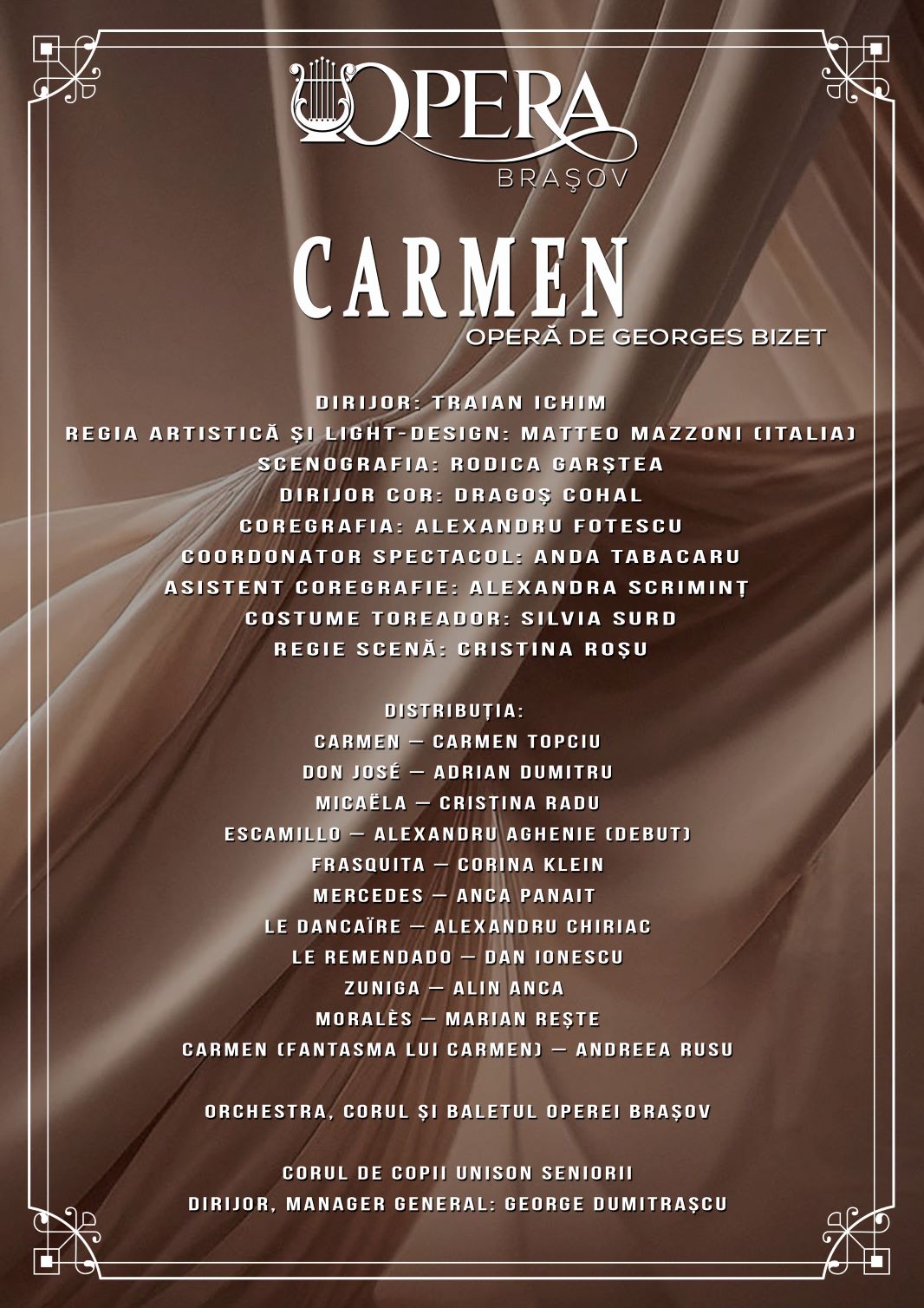 În distribuția spectacolului de sâmbăta aceasta, îi vom regăsi pe artiștii Operei Brașov: Carmen – Carmen Topciu, Don José – Adrian Dumitru, Micaëla – Cristina Radu, Escamillo – Alexandru Aghenie (debut), Frasquita – Corina Klein, Mercedes – Anca Panait, Le Dancaïre – Alexandru Chiriac, Le Remendado – Dan Ionescu, Zuniga – Alin Anca (debut), Moralès – Marian Rește, Carmen (Fantasma lui Carmen) – Andreea Rusu. Își dau concursul Orchestra, Corul și Baletul Operei Brașov. Participă, de asemenea, Corul de copii UNISON Seniorii – Dirijor, manager general: George Dumitrașcu. Maestrul Traian Ichim se va afla la pupitrul dirijoral, asigurând conducerea muzicală a spectacolului. Regia artistică și light-design-ul îi aparțin lui Matteo Mazzoni (Italia). Scenografia: Rodica Garștea. Dirijor cor: Dragoș Cohal. Coregrafia: Alexandru Fotescu. Coordonator spectacol: Anda Tabacaru. Asistent coregrafie: Alexandra Scriminț. Costume Toreador: Silvia Surd. Regie scenă: Cristina Roșu.