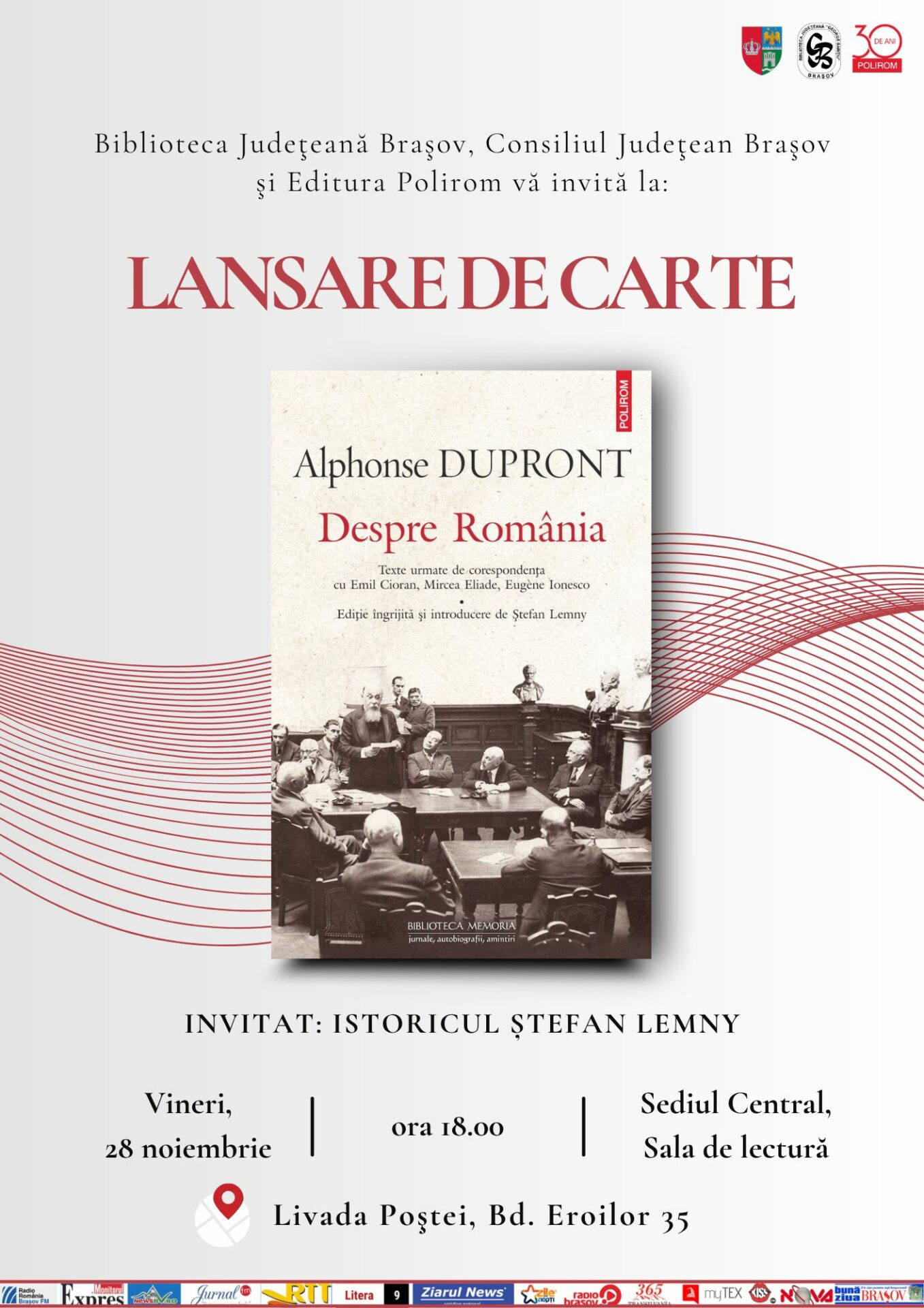 Biblioteca Judeţeană invită publicul brașovean la lansarea cărţii „Despre România” de Alphonse Dupront, apărută recent în limba română la Editura Polirom şi îngrijită de istoricul şi editorul Ştefan Lemny. Evenimentul va avea loc vineri, 28 noiembrie 2025, de la orele 18,00, la Sala de lectură a Bibliotecii Judeţene Braşov (Livada Poştei, Bd. Eroilor nr. 35, sediul central, etaj 1). […]